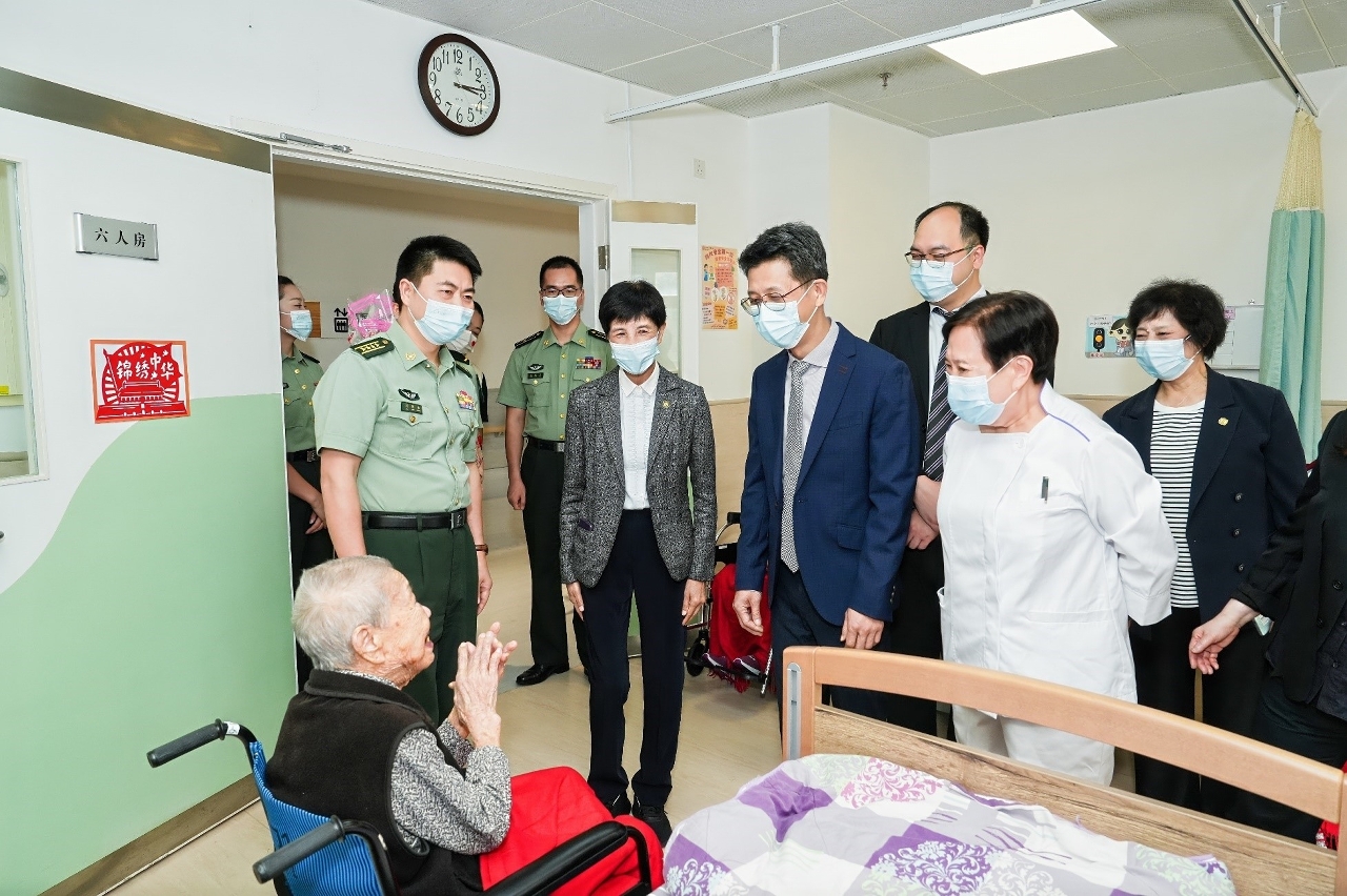駐澳部隊官兵代表和社會工作局人員首先參觀了工聯九澳護養院的住宿樓層,於生活區向長者問好,並到房間慰問臥床及安養的長者,向他們致以真摯的祝福,肯定他們為澳門建設發展做出的貢獻。
