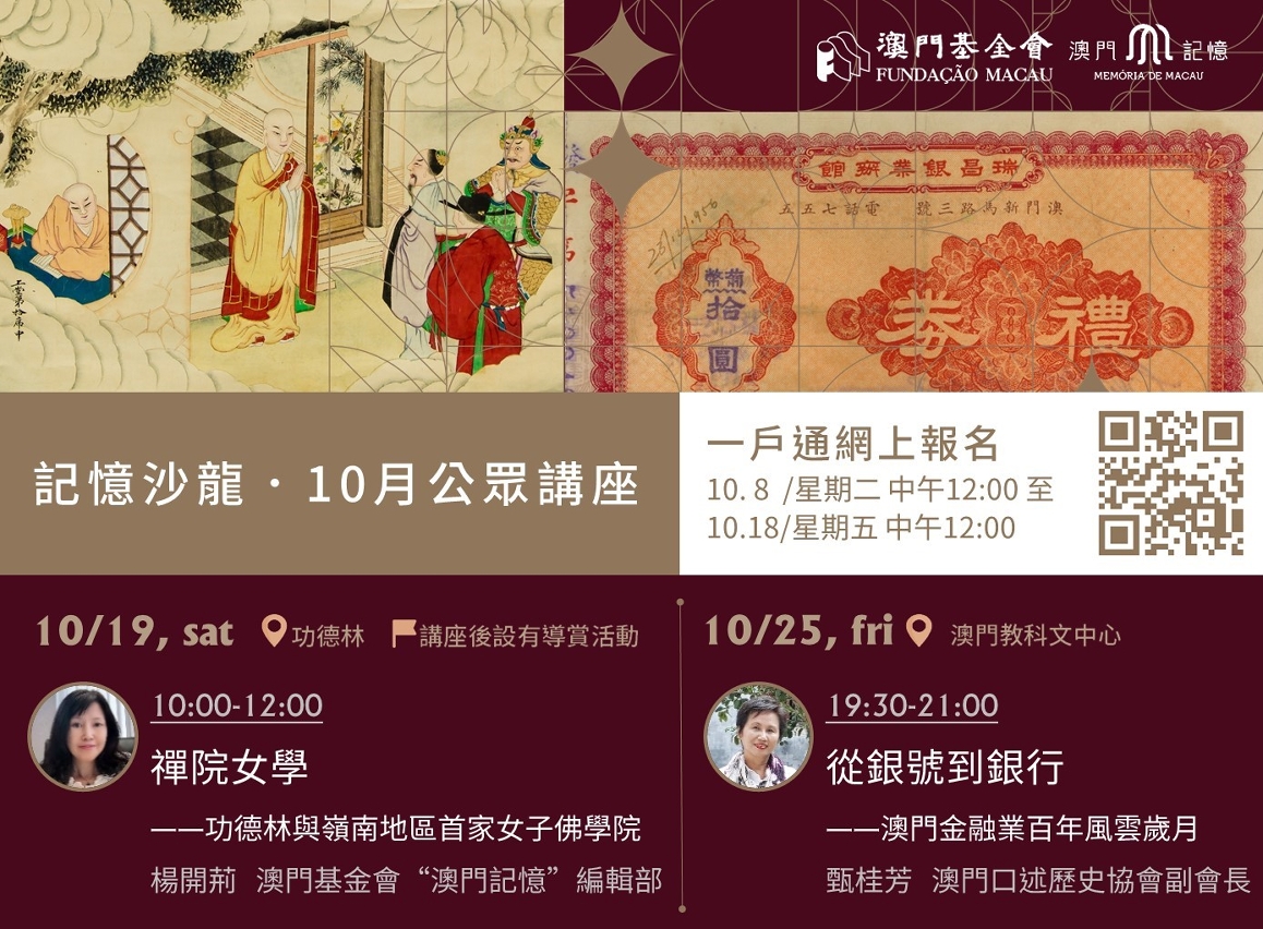 步入十月,“澳門記憶”將繼續為大家帶來兩場經典主題的“記憶沙龍”。首場講座由澳門基金會“澳門記憶”編輯部的楊開荊博士主講“禪院女學——功德林與嶺南地區首家女子佛學院”,將於10月19日上午10時在功德林寺院內舉行。2023年5月,《澳門功德林寺院檔案文獻(1645-1980年)》成功申報聯合國教科文組織(UNESCO)《世界記憶(國際)名錄》,消息令人鼓舞。本次講座得到功德林寺院方大力支持,結合院內參觀活動,參與者有機會一睹這批珍貴的歷史文遺,是難得的歷史文化體驗。另一場講座將於10月25日晚上19:30在澳門教科文中心舉行,由澳門口述歷史協會副會長甄桂芳主講,題為“從銀號到銀行——澳門金融業百年風雲歲月”。該講座是經由市民投票選出的“我最想重溫的記憶沙龍”之一,特別適合早前未能參加的朋友。機會難逢、切勿錯過!