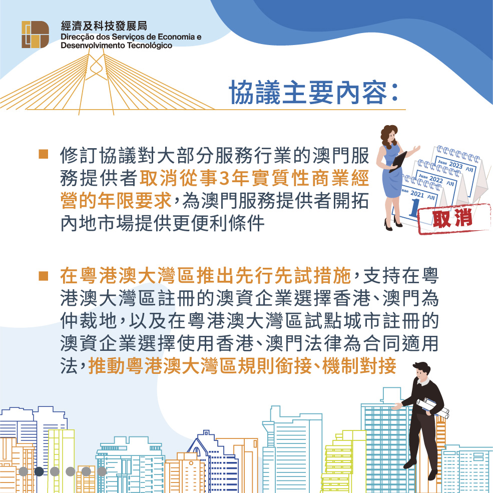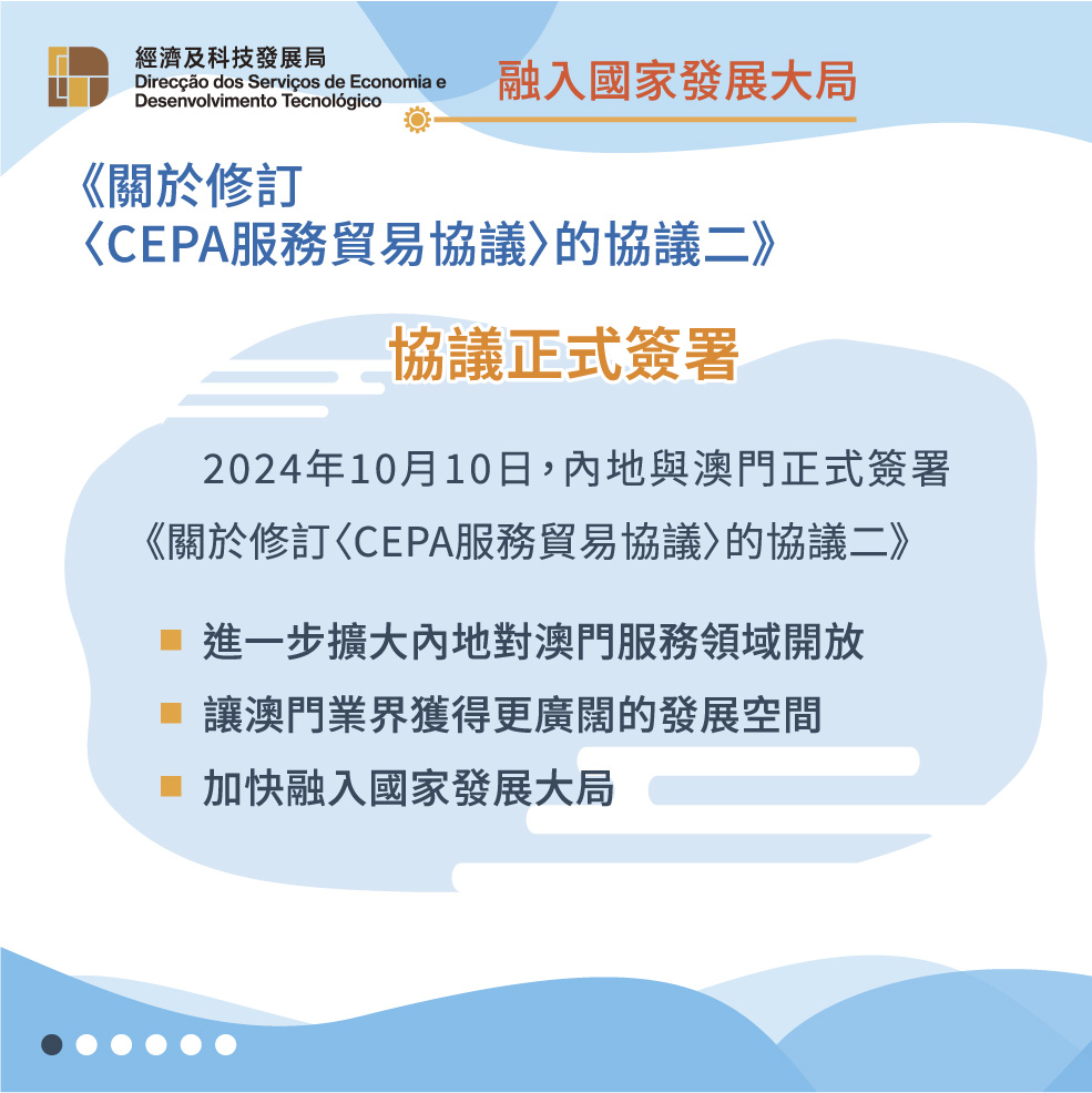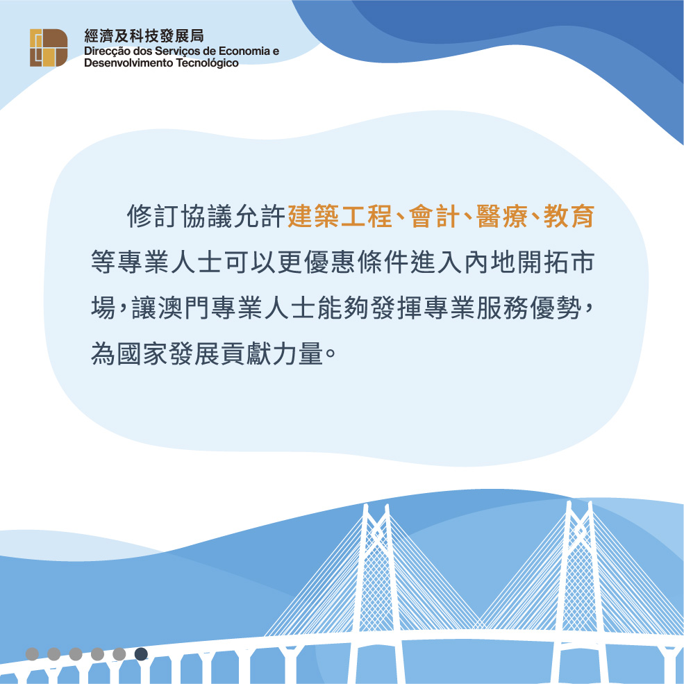 此外,《修訂協議二》進一步提升對澳門專業服務的開放水平,允許建築工程、會計、醫療、教育等專業人士可以更優惠條件進入內地市場,讓澳門服務提供者能夠發揮優勢,為國家發展貢獻力量。
