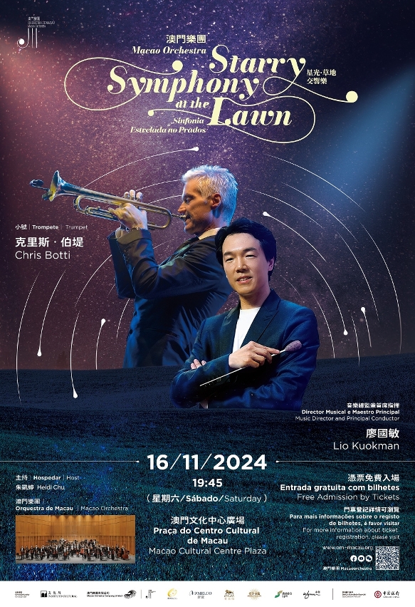 澳門樂團2024-25樂季演出之一的《星光‧草地‧交響樂》音樂會,將於11月16日(周六)晚上7時45分在澳門文化中心廣場上演,由澳門樂團音樂總監兼首席指揮廖國敏帶領澳門樂團與國際知名的格林美“小號天王”克里斯‧伯堤聯手,呈獻一場集流行經典與爵士元素於一體的露天音樂會。音樂會免費入場,門票以“先登記、後抽籤”的形式派發,歡迎有興趣人士於即日起至10月23日23:59分登記,每人最多可登記兩張門票。