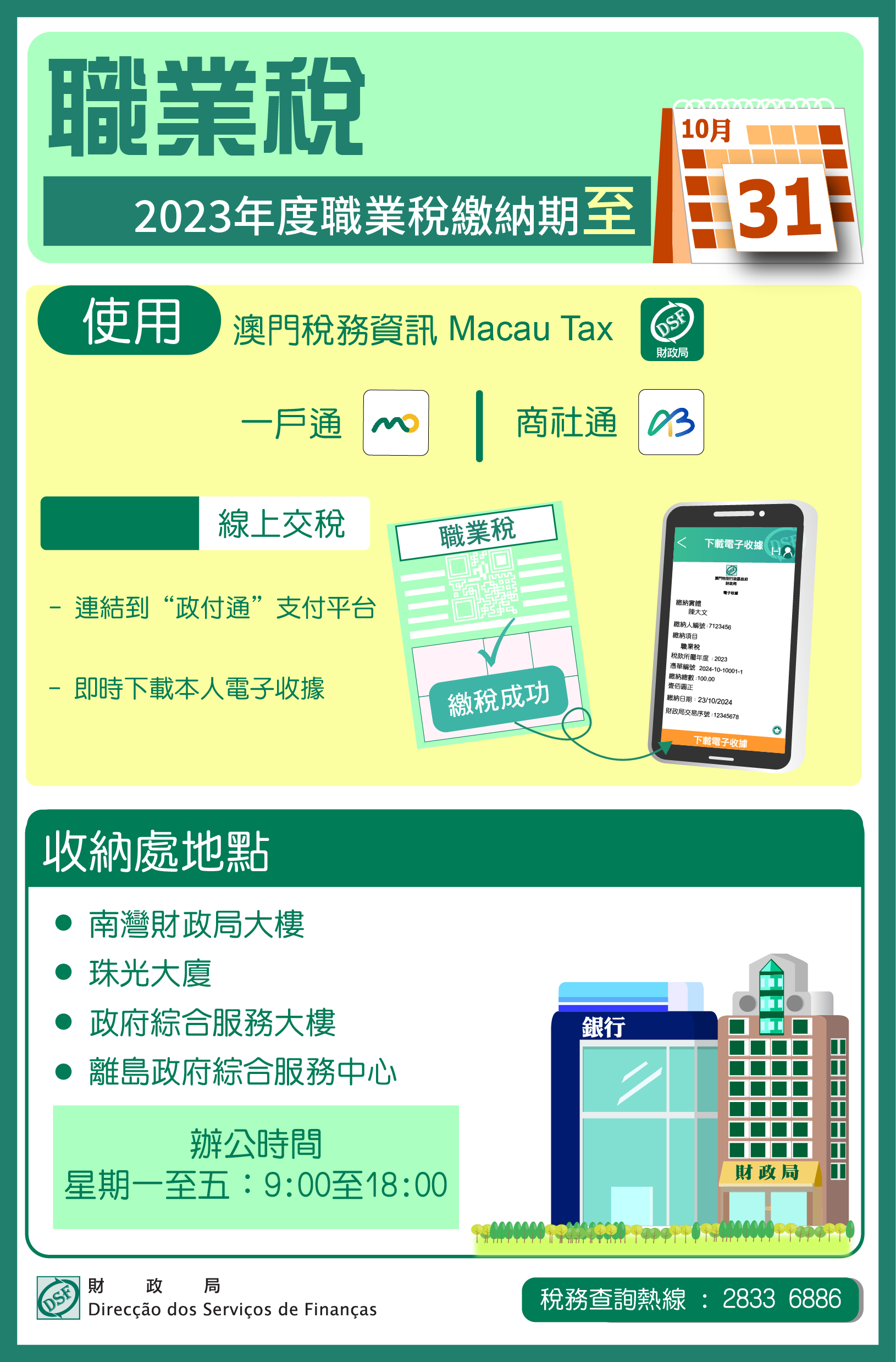 財政局提醒職業稅納稅人,2023年度從收益中扣繳之職業稅稅款及結算稅款間之差額,最後繳納期限至10月31日。為免因逾期繳納而附加過期利息及罰款,仍未繳納上述稅款之納稅人須儘快繳納。