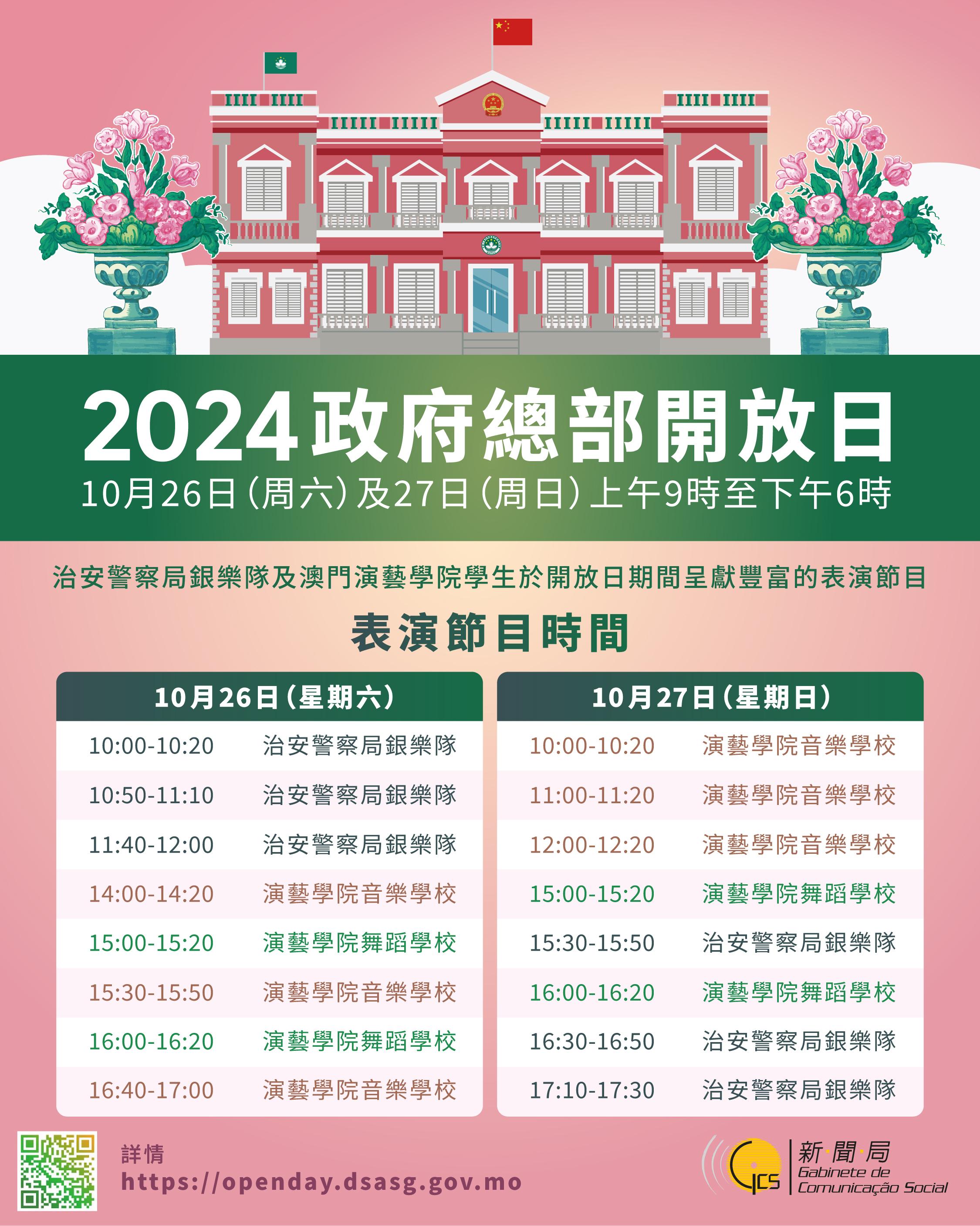 政府總部將於本月26日(周六)及27日(周日)上午9時至下午6時向公眾開放,屆時公眾可參觀政府總部的禮賓樓及花園。為與公眾同賀雙慶之年,今年開放日的花卉展主題為“慶祝中華人民共和國成立75周年及澳門回歸祖國25周年”,期間還設有銀樂隊和舞蹈表演,為參觀人士帶來喜慶氣氛。