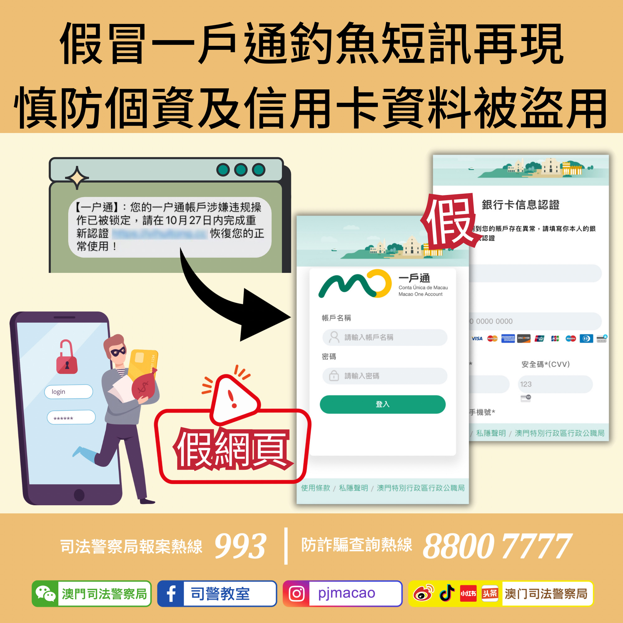 今日(2024年10月27日),司法警察局發現有人假冒一戶通發出釣魚短訊,內容以一戶通違規操作被鎖定為由,要求市民點撃短訊內附帶的連結以便恢復正常使用。