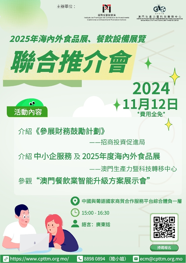 歡迎本澳企業代表報名參與此次推介會,共同探索更多發展合作機遇,推動澳門食品及餐飲業蓬勃發展。有意出席者,請於11月8日前在生產力中心網站(http://www.cpttm.org.mo)線上登記或掃描海報二維碼報名。如有任何查詢,歡迎於辦公時間內致電8898 0894與生產力中心陸小姐聯繫。