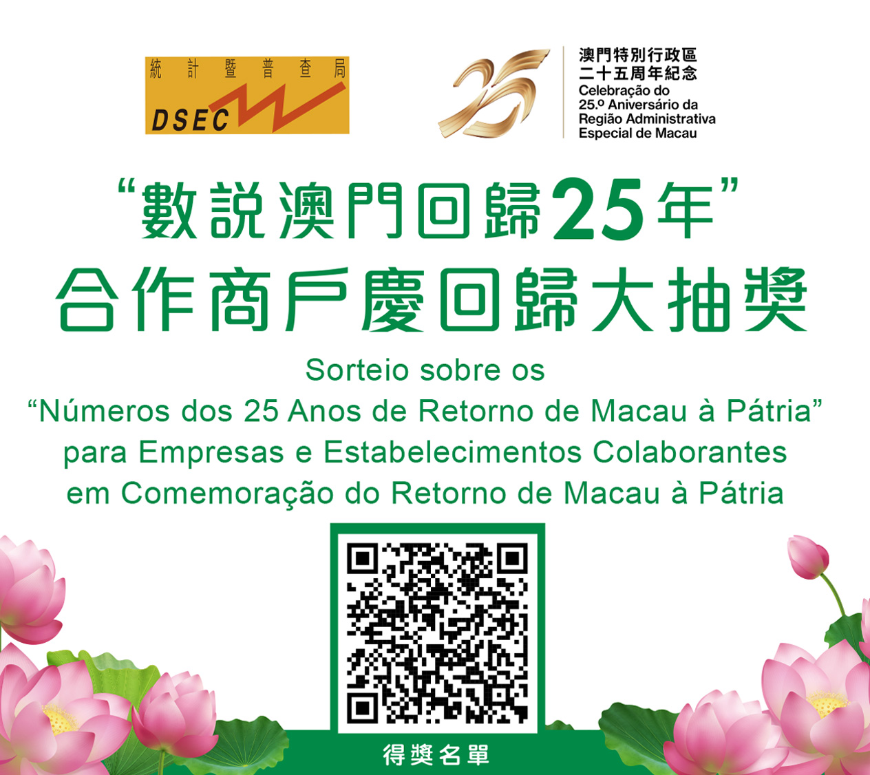 抽獎儀式已於日前舉行,共抽出250間得獎企業/場所,得獎名單請參閱統計暨普查局網頁(https://www.dsec.gov.mo/zh-MO/Knowledge/Return25LuckyDraw);此外,局方將以信函方式通知得獎企業/場所有關領獎事宜。