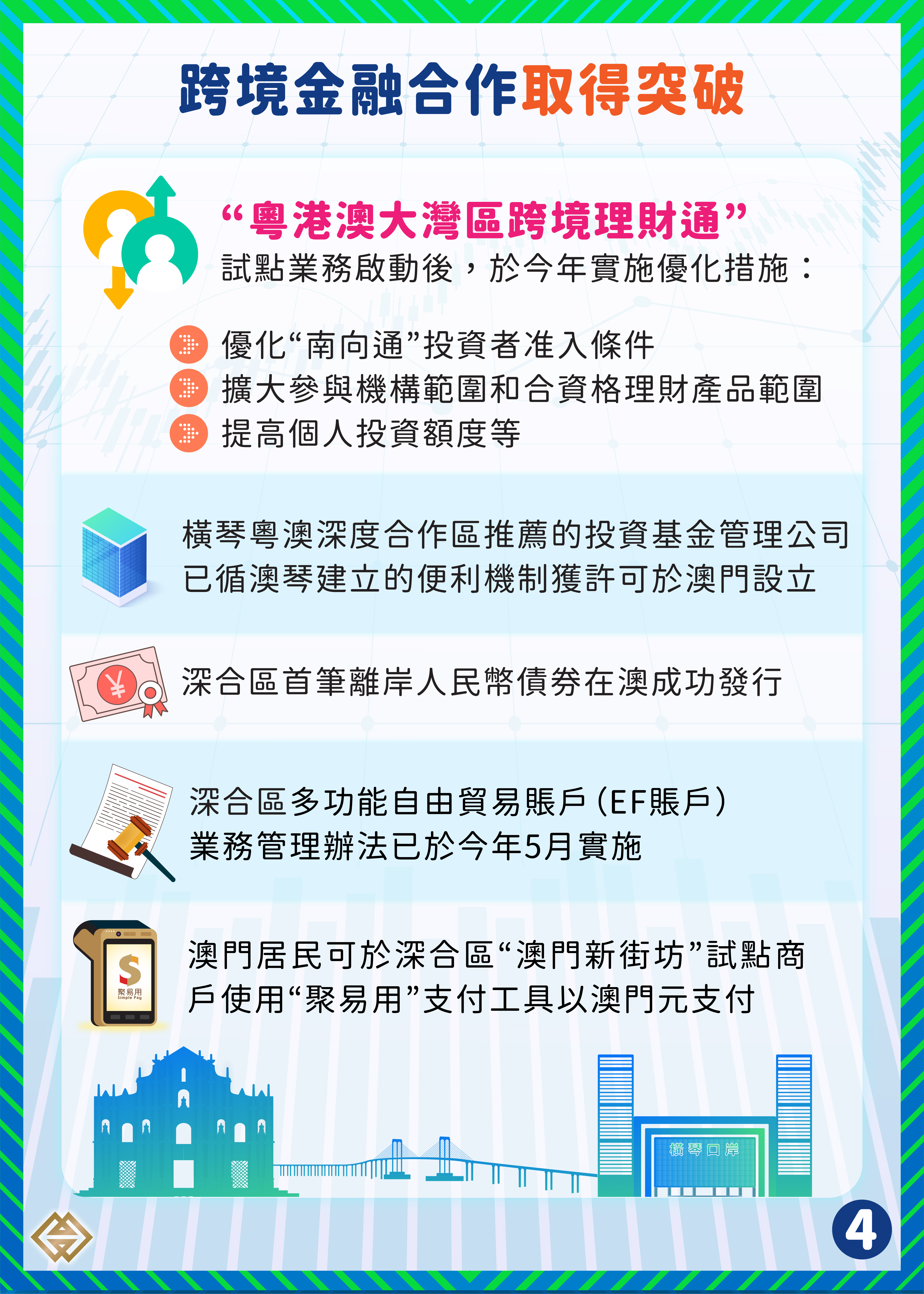深合區多功能自由貿易賬戶(EF賬戶)業務管理辦法已於今年5月實施;澳門居民可於深合區“澳門新街坊”試點商戶使用“聚易用”支付工具以澳門元支付。