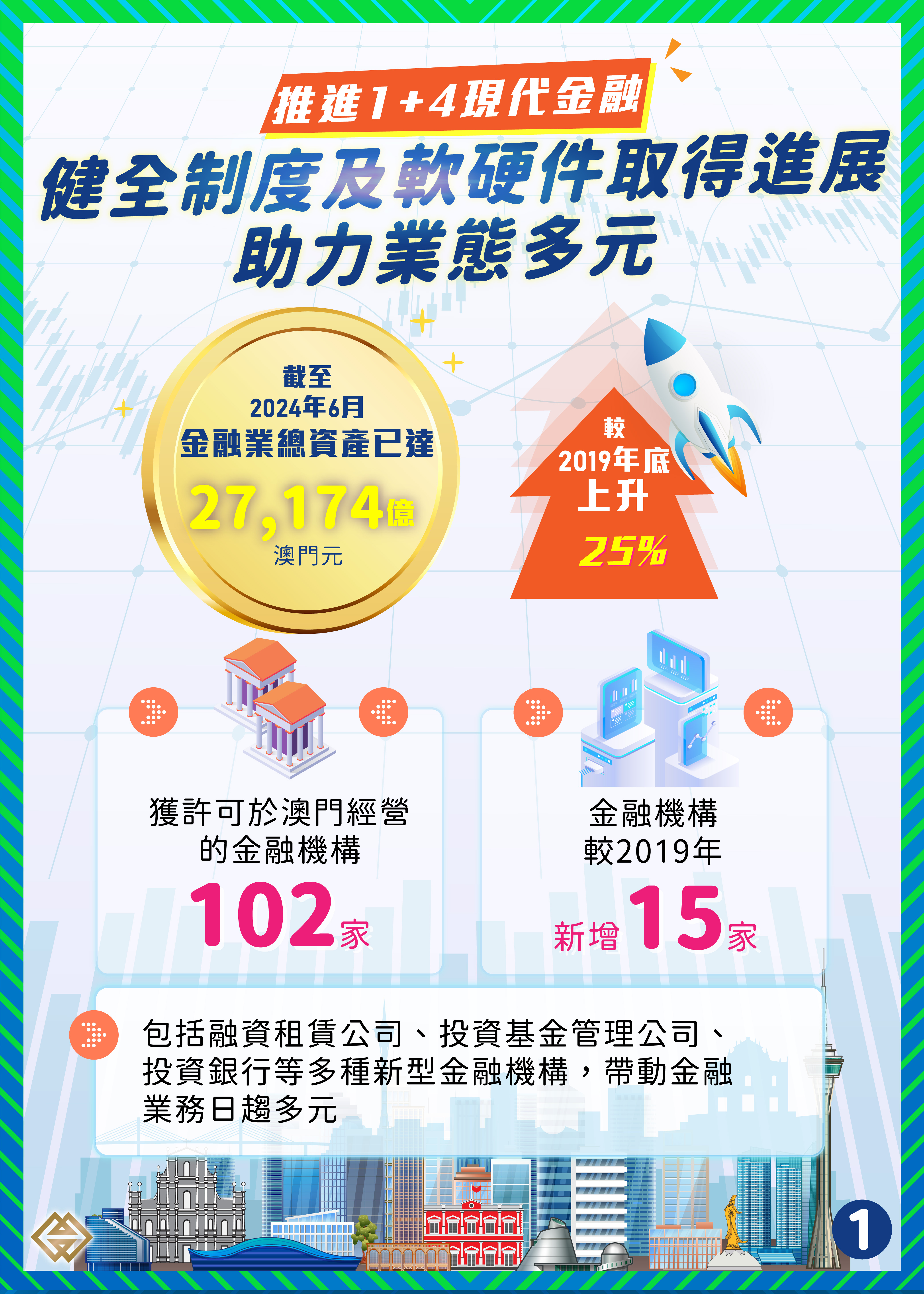 至2024年6月底,澳門金融業的資產總值已達27,174億澳門元,較2019年上升了25%。