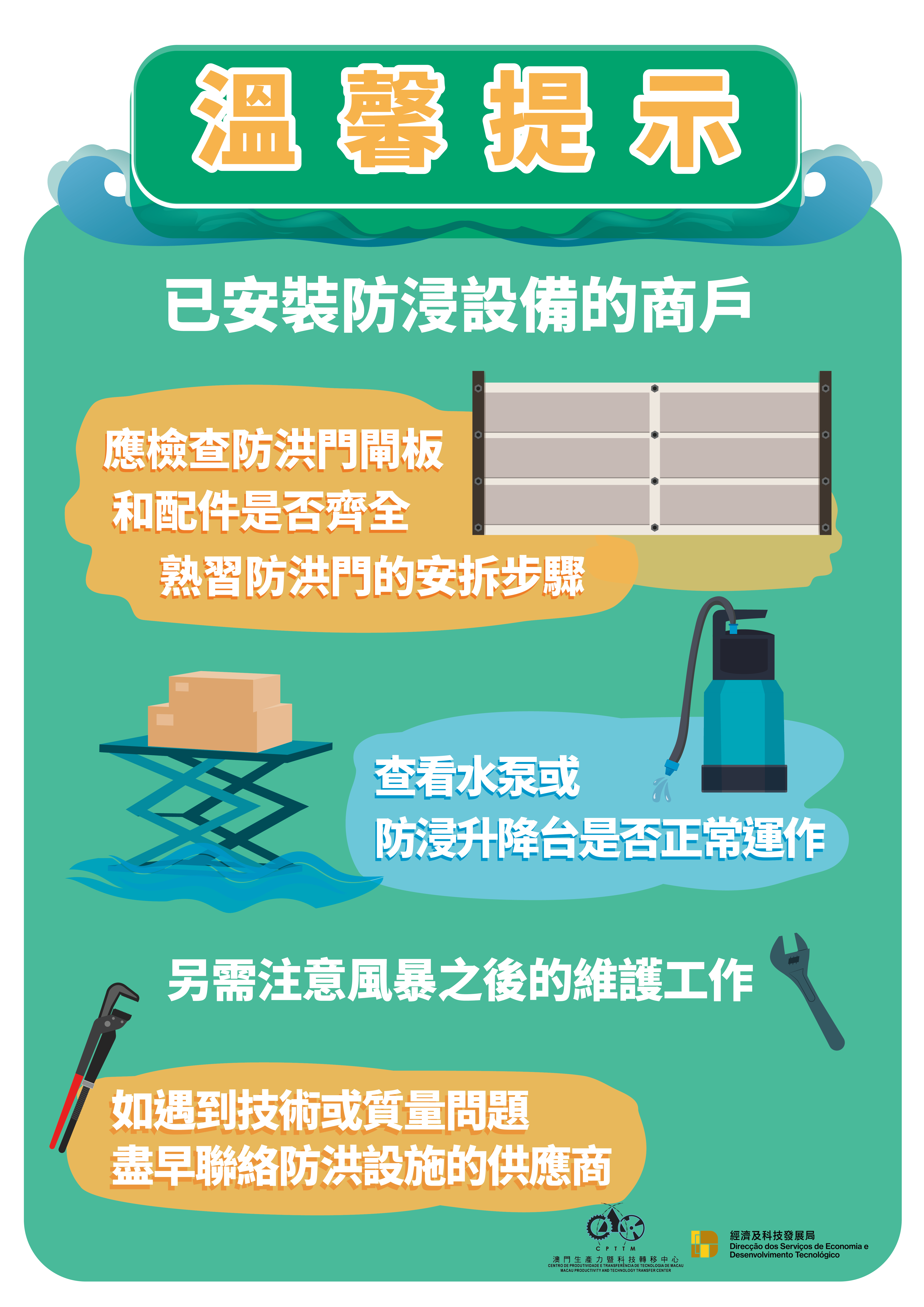 已安裝防浸設備的商戶,應檢查防洪門閘板和配件是否齊全,熟習防洪門的安拆步驟;已安裝防浸升降台和水泵的商戶,應檢查設備是否正常運作。如有疑問,應盡快向所屬的工程公司或供應商了解,做好準備,以策萬全。