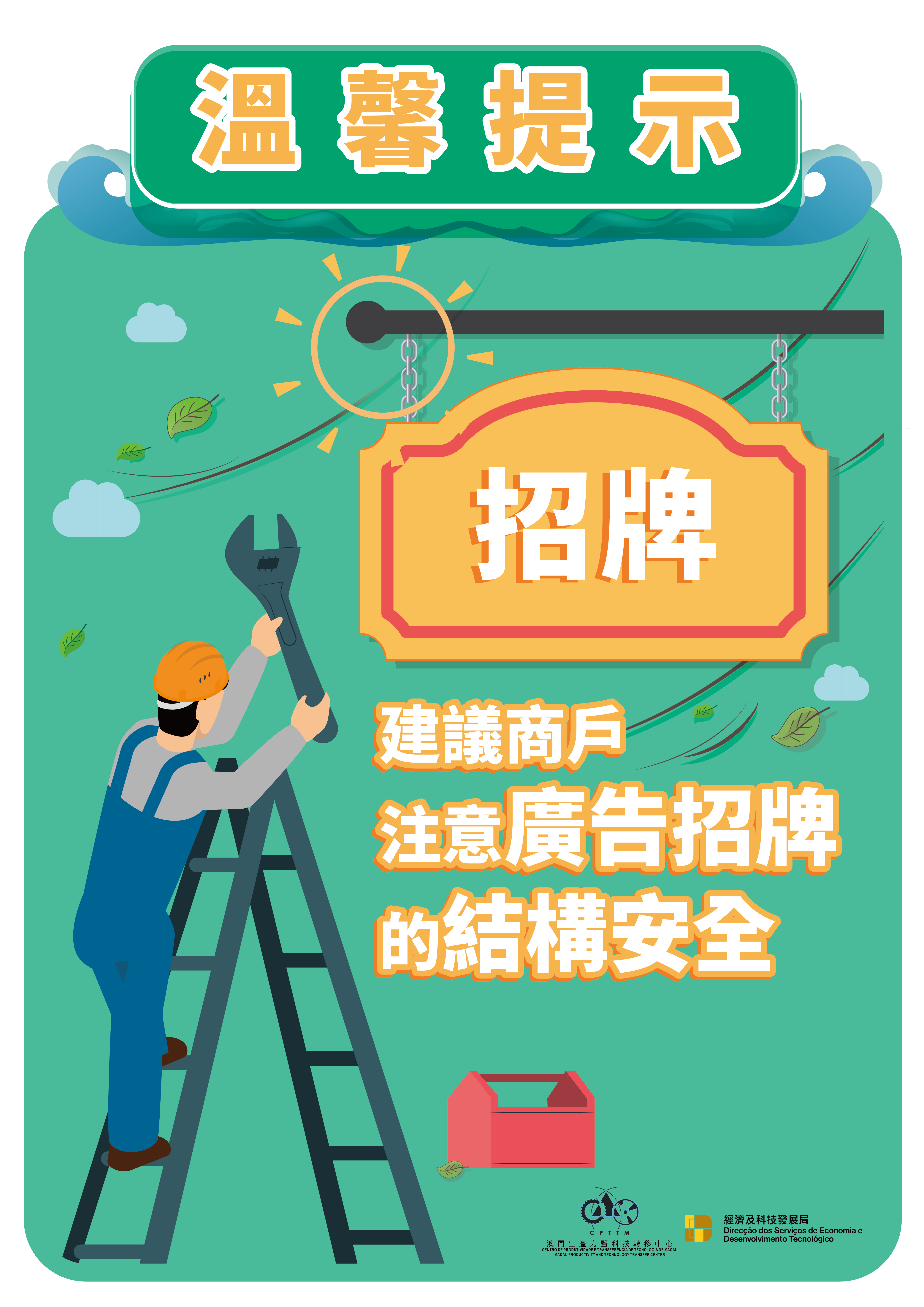 地球物理氣象局已發出一號風球信號,並預料本澳風勢較大。經濟及科技發展局與澳門生產力暨科技轉移中心呼籲,各商戶特別是位處低窪地區的中小企業,應做好防風防浸的準備工作及預防措施,以免造成貨物及設備損失。同時,商戶應密切留意氣象局發佈的最新天氣情況。