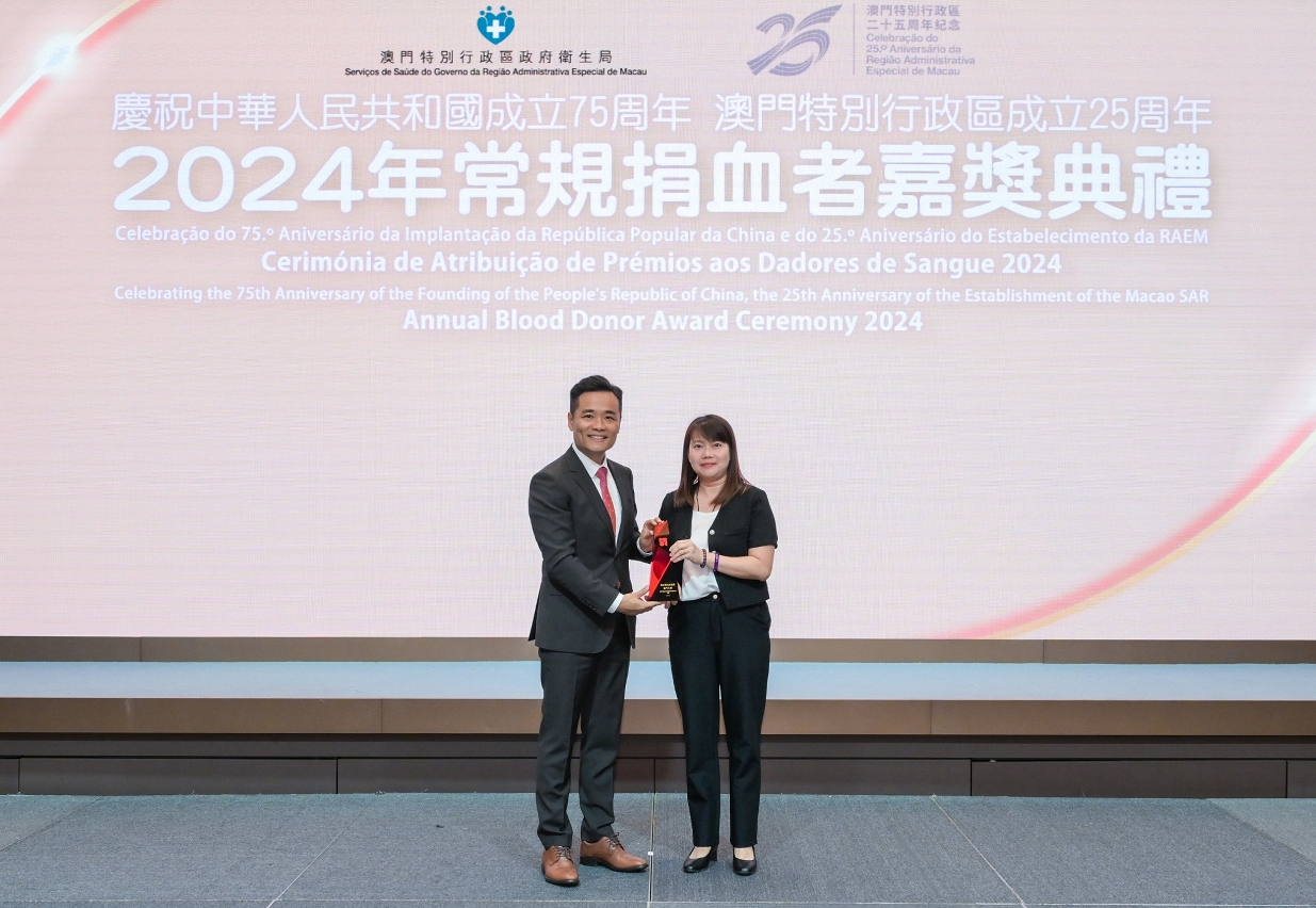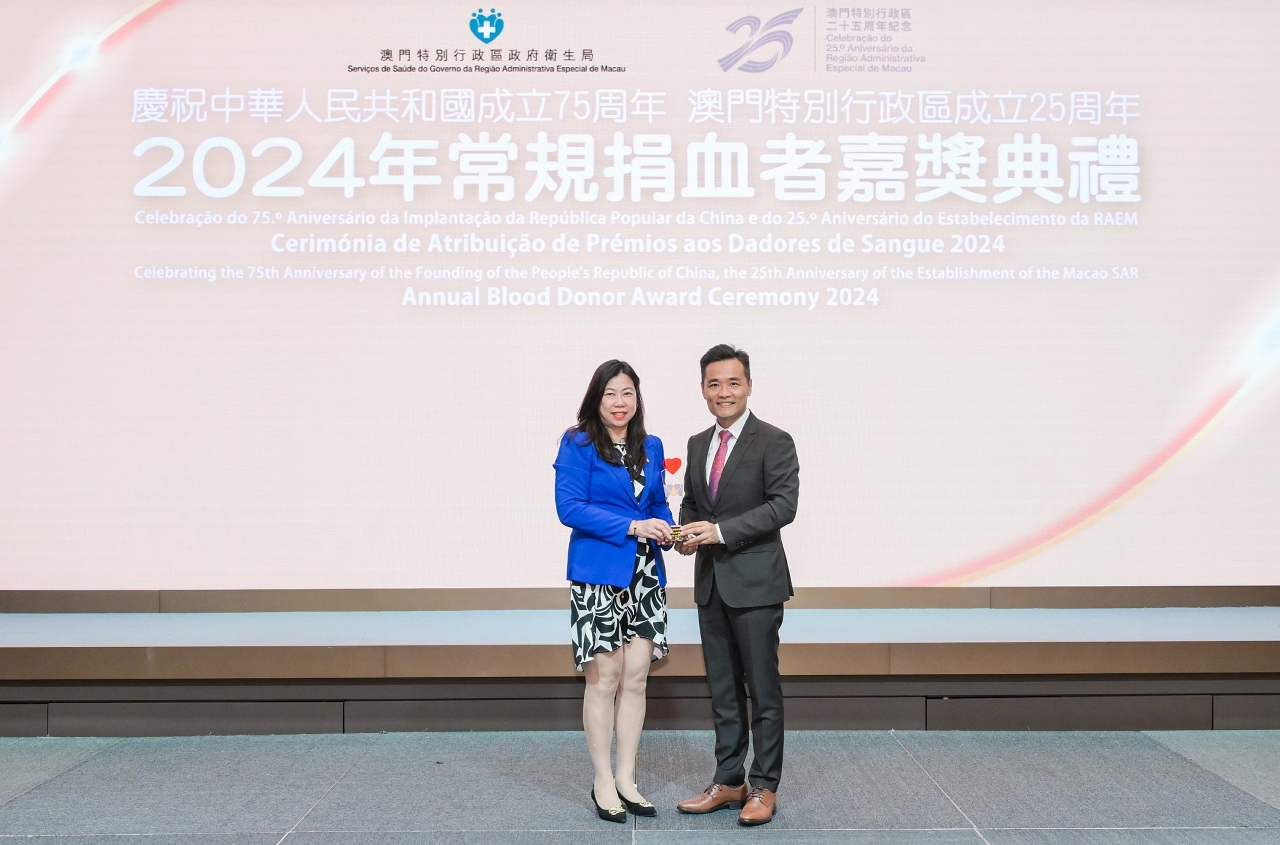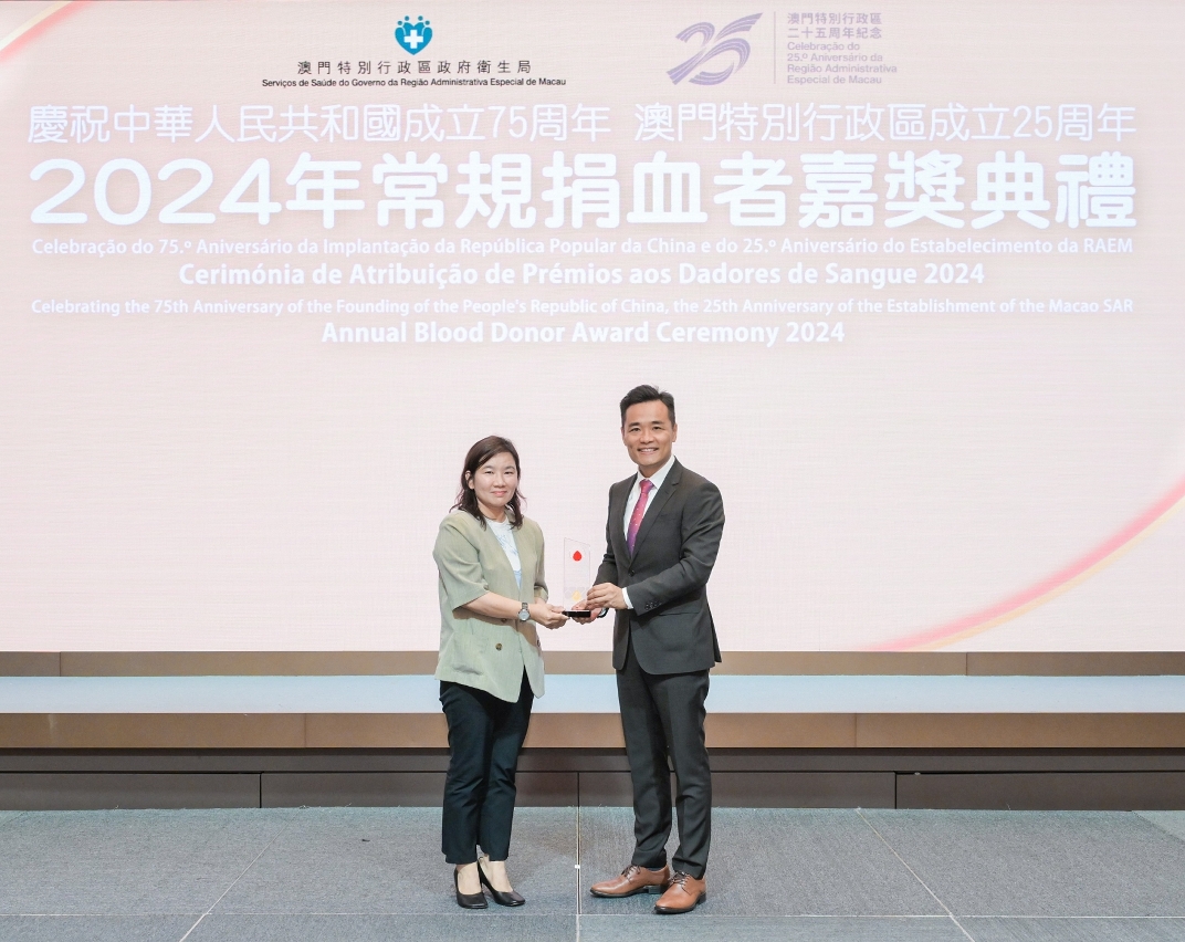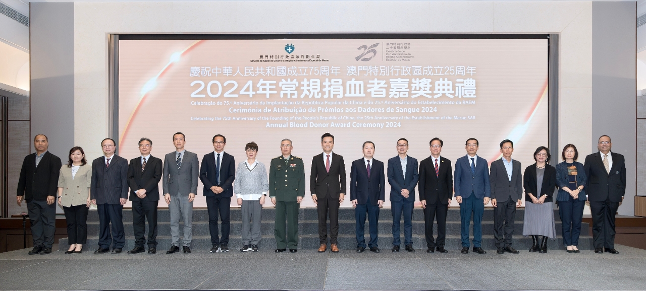 慶祝中華人民共和國成立75周年、澳門特別行政區成立25周年-2024年常規捐血者嘉奬典禮於日前圓滿舉行。衛生局羅奕龍局長、中國人民解放軍駐澳門部隊保障部張春棟部長、中央人民政府駐澳門特別行政區聯絡辦公室宣傳文化部綜合處王惠杰處長等出席了典禮,並向獲獎的部門、團體、機構、學校和個人等頒發奬項,以公開表揚無私奉獻的捐血者和協助推動捐血的社團和機構,以引起社會共同關注本澳血液需求,鼓勵更多居民積極參與捐血活動。