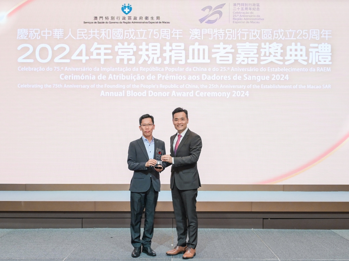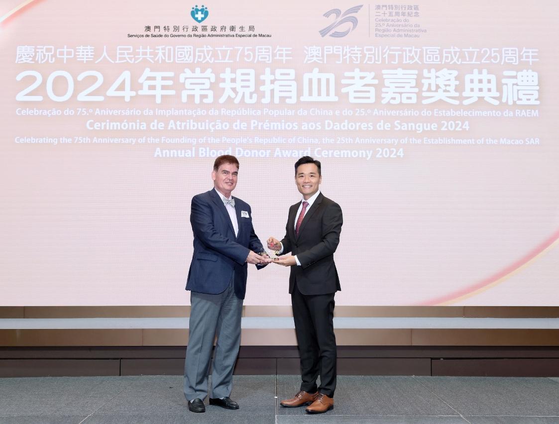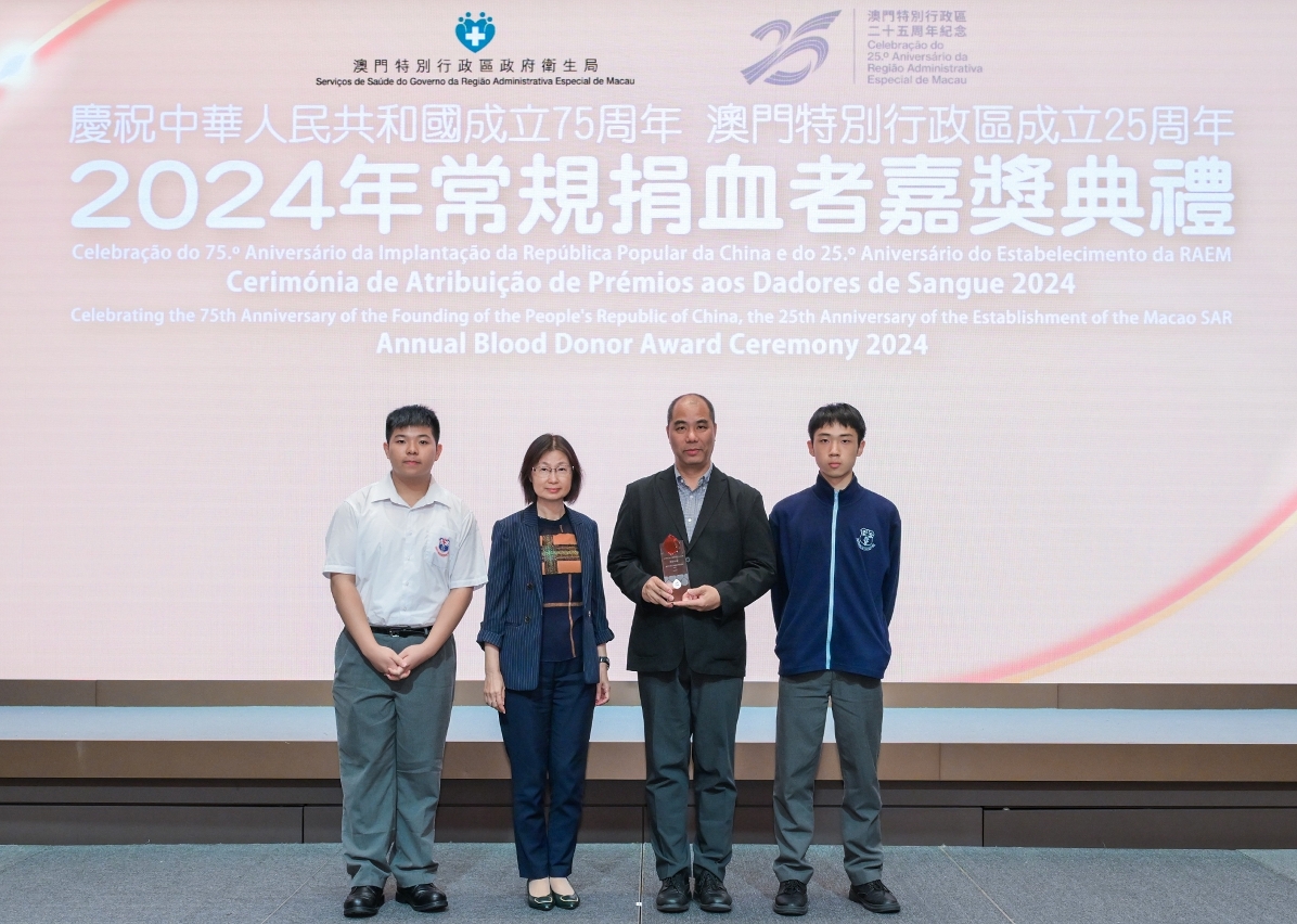 慶祝中華人民共和國成立75周年、澳門特別行政區成立25周年-2024年常規捐血者嘉奬典禮於日前圓滿舉行。衛生局羅奕龍局長、中國人民解放軍駐澳門部隊保障部張春棟部長、中央人民政府駐澳門特別行政區聯絡辦公室宣傳文化部綜合處王惠杰處長等出席了典禮,並向獲獎的部門、團體、機構、學校和個人等頒發奬項,以公開表揚無私奉獻的捐血者和協助推動捐血的社團和機構,以引起社會共同關注本澳血液需求,鼓勵更多居民積極參與捐血活動。