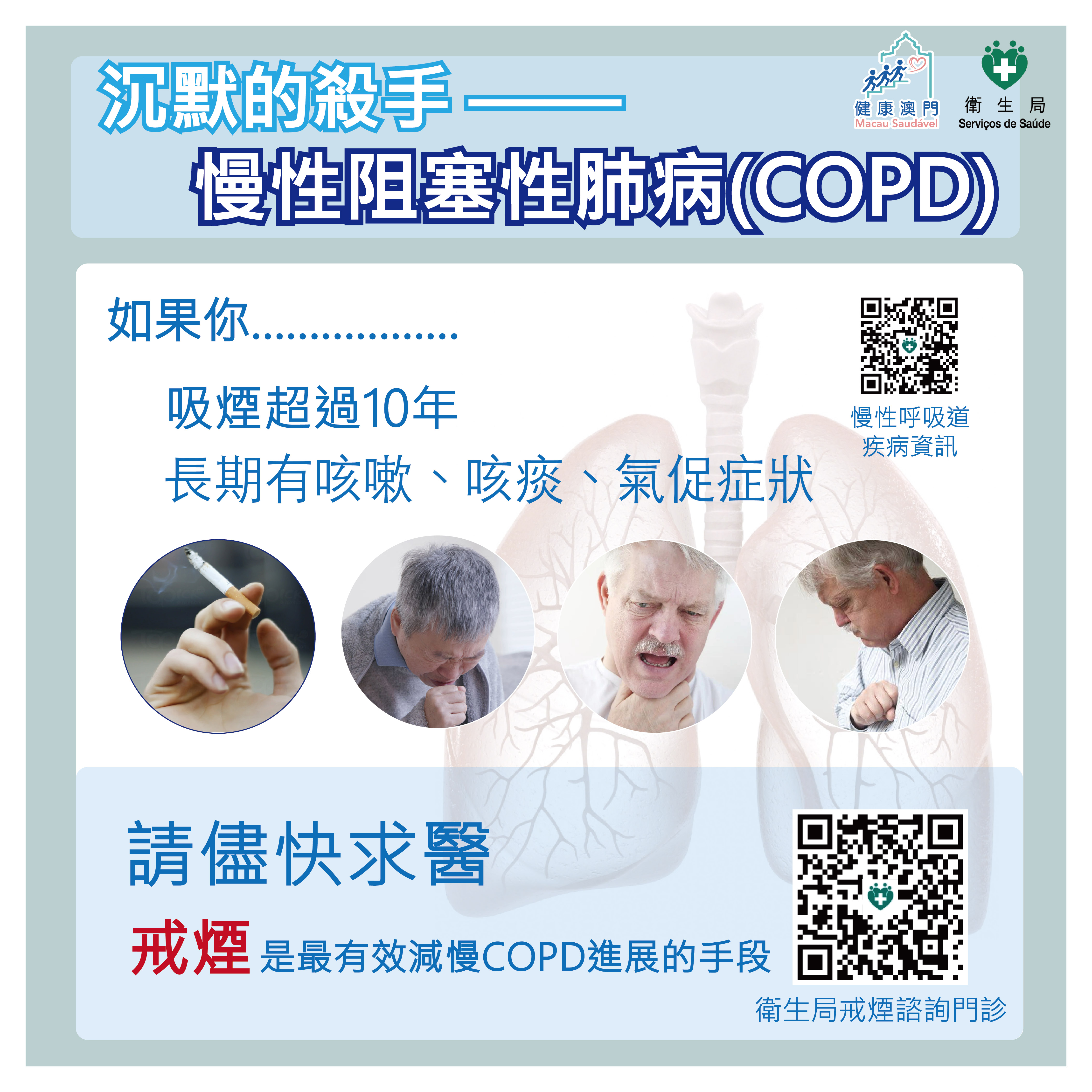 衛生局指出,超過90%的慢阻肺患者有吸煙史,故戒煙是最有效防治慢阻肺的手段,可預防肺功能加速惡化,降低致病率與死亡率,因此,建議有吸煙習慣的人士儘早戒煙。本澳各區衛生中心均設有“戒煙諮詢門診",為居民提供免費的諮詢及戒煙服務。如欲了解更多,可瀏覽“戒煙諮詢門診資訊網"或致電2848 1238查詢。