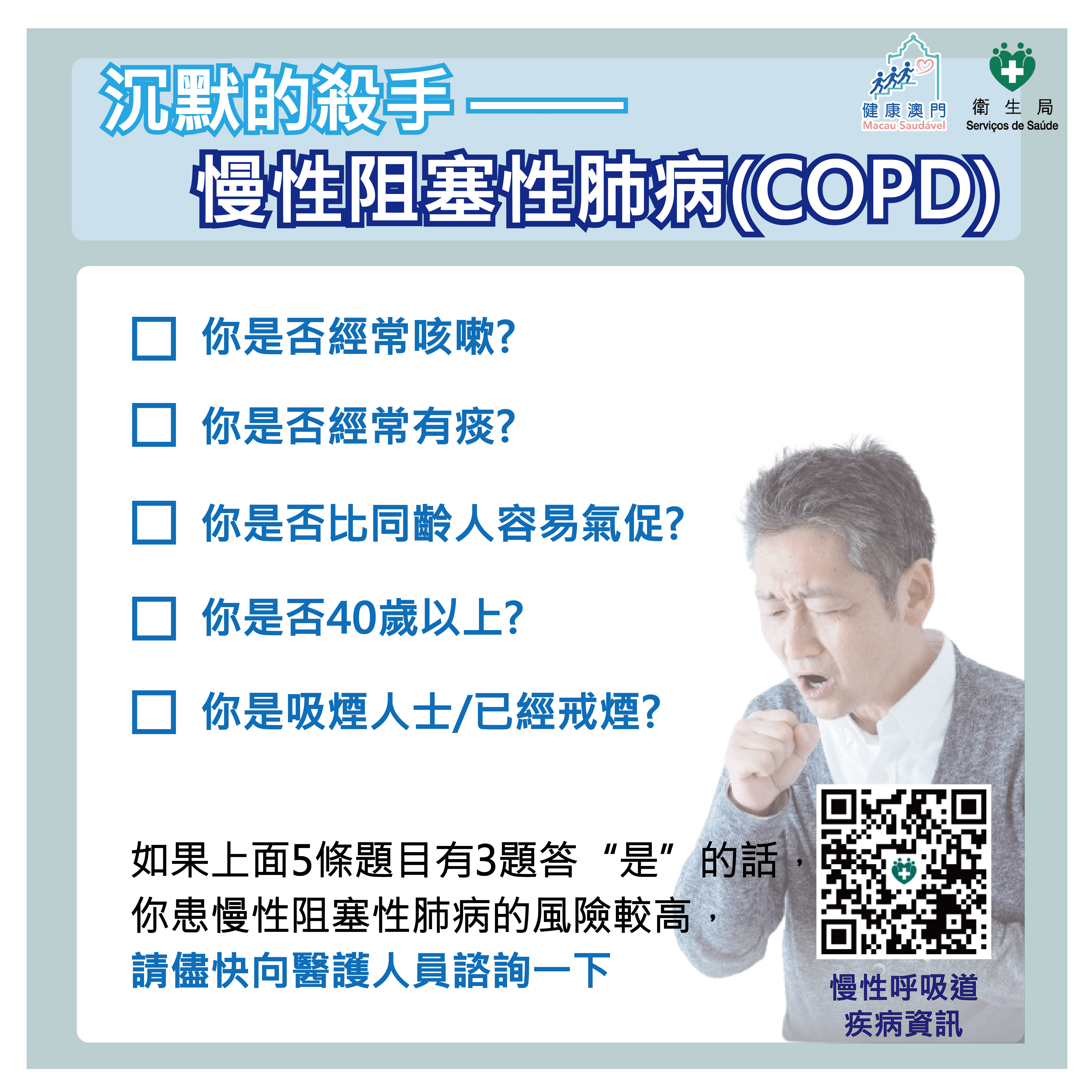 通過肺功能檢測能早期診斷慢阻肺。衛生局提醒,年齡40歲以上、曾吸煙超過10年(即使已戒煙)、有長期咳嗽且伴有痰、或較同齡人容易氣促的人士,患有慢阻肺的風險較高,建議定期諮詢醫生,醫生會根據情況適時安排肺功能檢測。