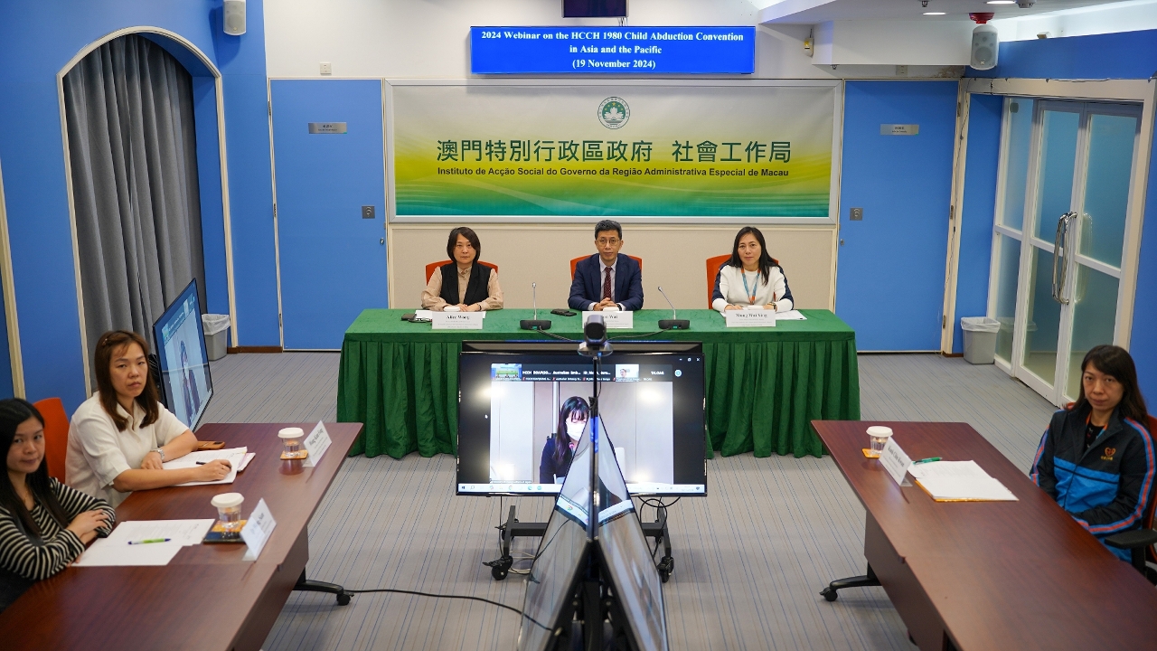 由海牙國際私法會議亞太區辦事處與日本外務省共同主辦的“2024年亞太地區1980年海牙兒童誘拐公約網絡研討會” 於11月19日舉行,澳門特別行政區政府社會工作局作為澳門特區負責履行1980年海牙《國際性誘拐兒童民事方面的公約》(下稱“《公約》”)所規定任務之中央主管機關,參與是次研討會,與會人員包括社會工作局韓衛局長、法律及翻譯處王翠華處長,以及執行相關工作的人員。