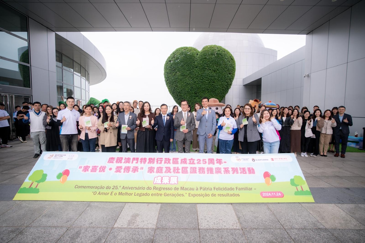 2024年為國際家庭年30周年及澳門特別行政區成立25周年,社會工作局聯同澳門工會聯合總會、聖公會澳門社會服務處,以及6個“分區協作聯網”共40多間社服機構,於今(24)日假澳門科學館會議廳舉辦慶祝澳門特別行政區成立25周年 -“家喜悅‧愛傳承”家庭及社區服務推廣系列活動成果展,由社會工作局鄧玉華副局長、中央人民政府駐澳門特別行政區聯絡辦公室社會工作部趙河清副部長、教育及青年發展局蔡敏芝代副局長、法務局行政及財政管理廳李勝里廳長、文化局讀者服務及推廣處林穎娜處長、衛生局余斌護士長、澳門工會聯合總會張國然副會長、聖公會澳門社會服務處葉鑑波服務總監主持啟動儀式。現場設有親子沉浸式互動劇場、時光走廊體驗、圖畫填色攤位、家庭教育成品展示、吉祥物拍照,以及活動主題微電影“以愛連城”首映等,共有800人次參與。