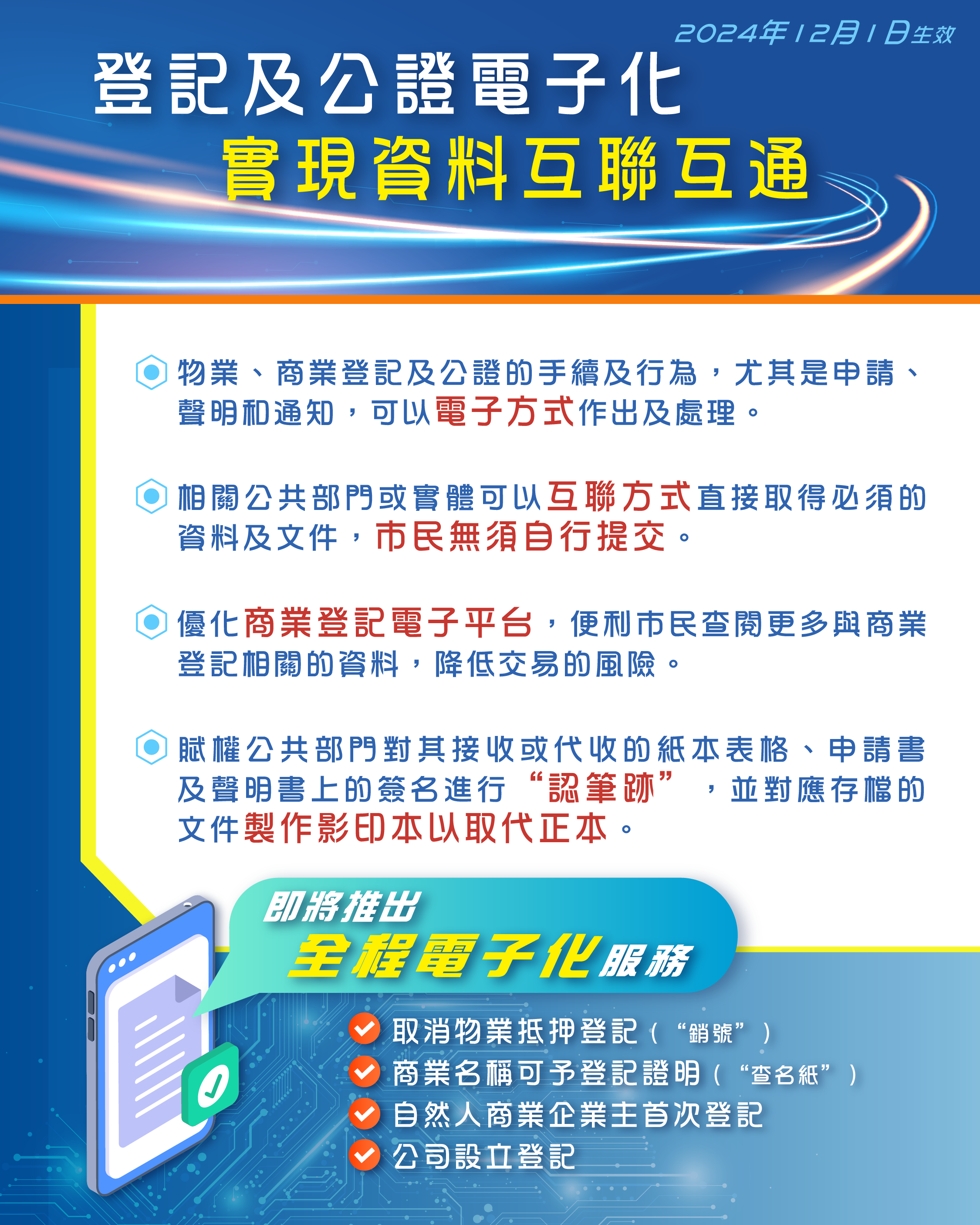 第18/2024號法律《物業、商業登記及公證的電子化》將於明(1日)生效,透過訂定以電子方式作出物業、商業登記及公證的手續及行為,優化相關流程,並規範登記公證機關與不同部門及實體之間的資料互聯互通,為市民提供更便捷的登記及公證服務。