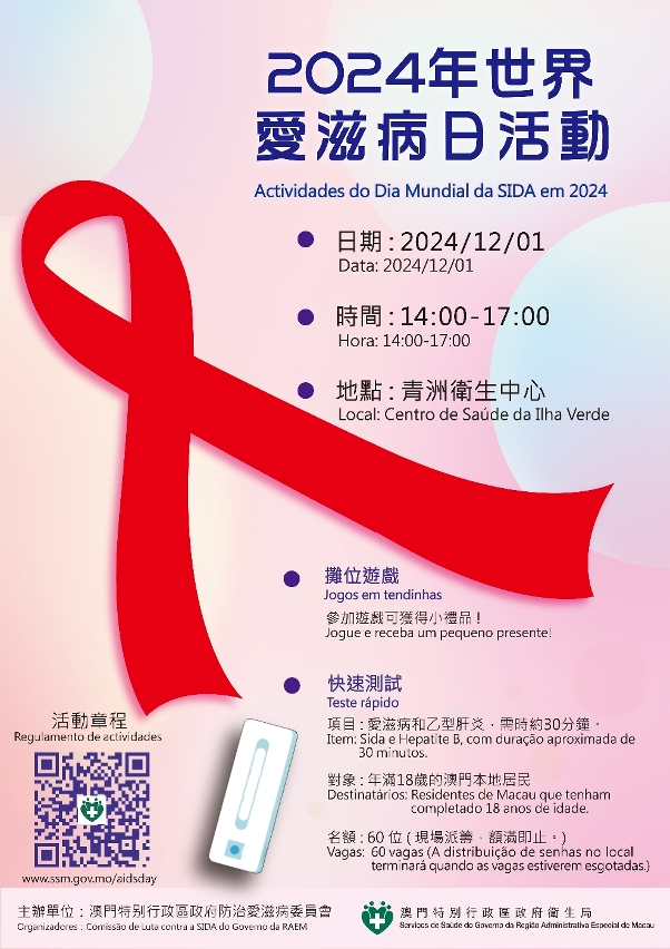 為提升居民對愛滋病的認識和關注,12月1日下午2時至5時,衛生局於青洲衛生中心地面層舉辦“世界愛滋病日”活動,設有檢測環節,包括愛滋病及乙型肝炎快速測試(名額有60個),對象為不清楚自己是否感染愛滋病毒或乙型肝炎病毒的年滿18歲澳門居民;另外,同場設有攤位遊戲,歡迎有興趣居民參加。
