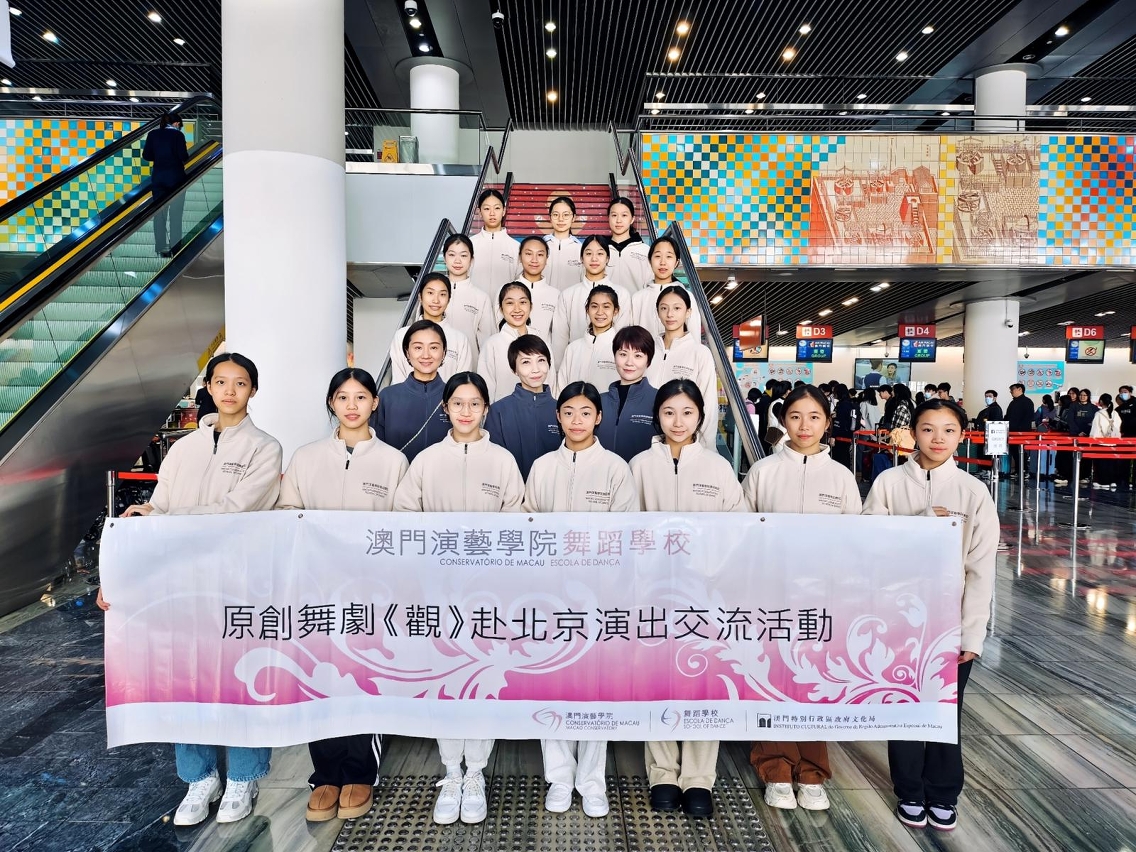 文化局轄下澳門演藝學院舞蹈學校第八屆舞蹈藝術表演課程畢業公演——原創舞劇《觀》在澳成功首演後移師北京,將於12月4日在北京吉祥大戲院再次上演。師生一行23人昨日(11月30日)由楊敏健校長帶領下啟程前往北京,參與北京舞蹈學院建校70周年70部原創舞劇展演活動。