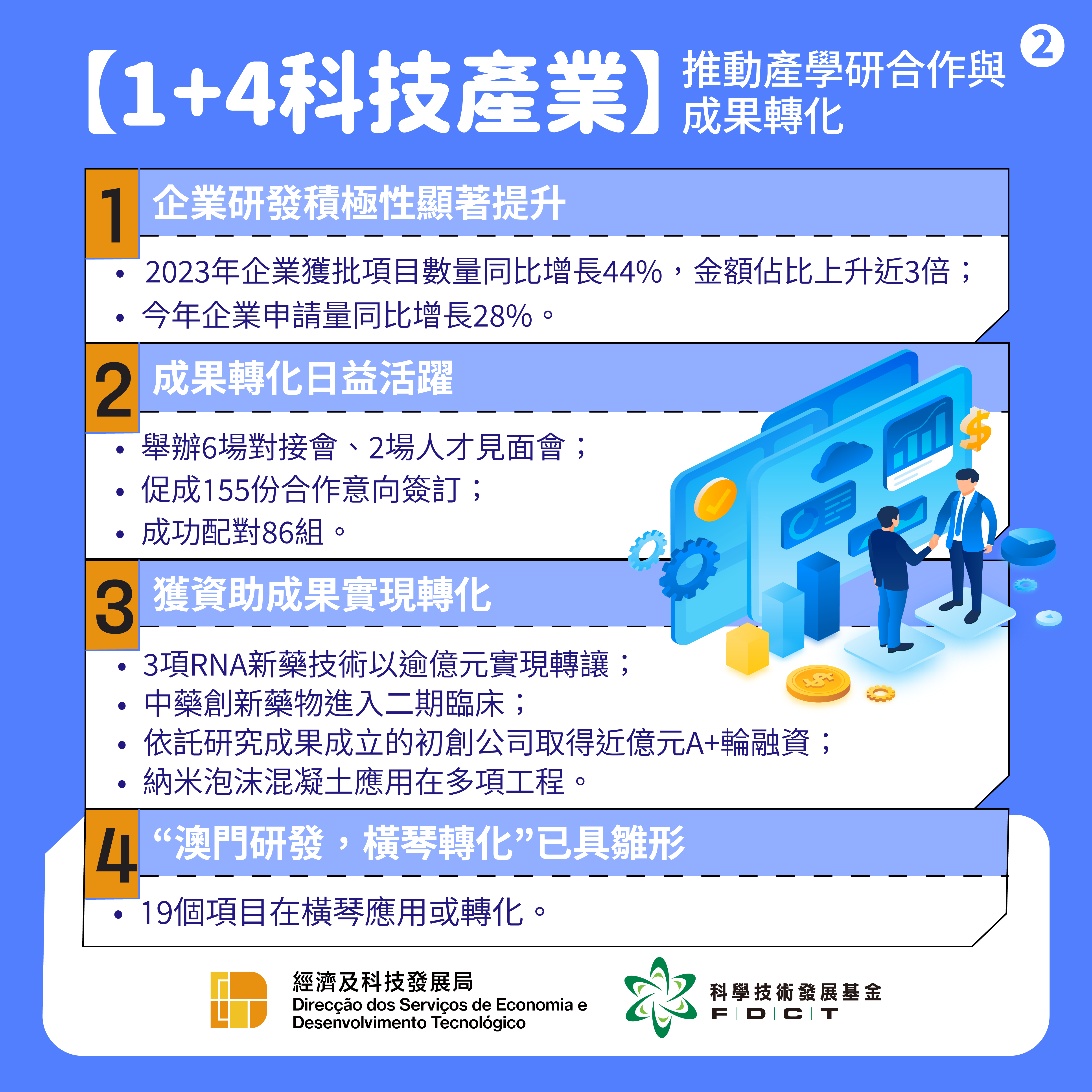 經濟及科技發展局於2023年推出了《科技企業認證計劃》助力本地科企發展,至今共有33家企業獲得認證,業務範圍涵蓋集成電路、資訊科技、人工智能、中醫藥等領域。33間企業聘用員工約1,300人,加總的年營收規模超過30億澳門元。