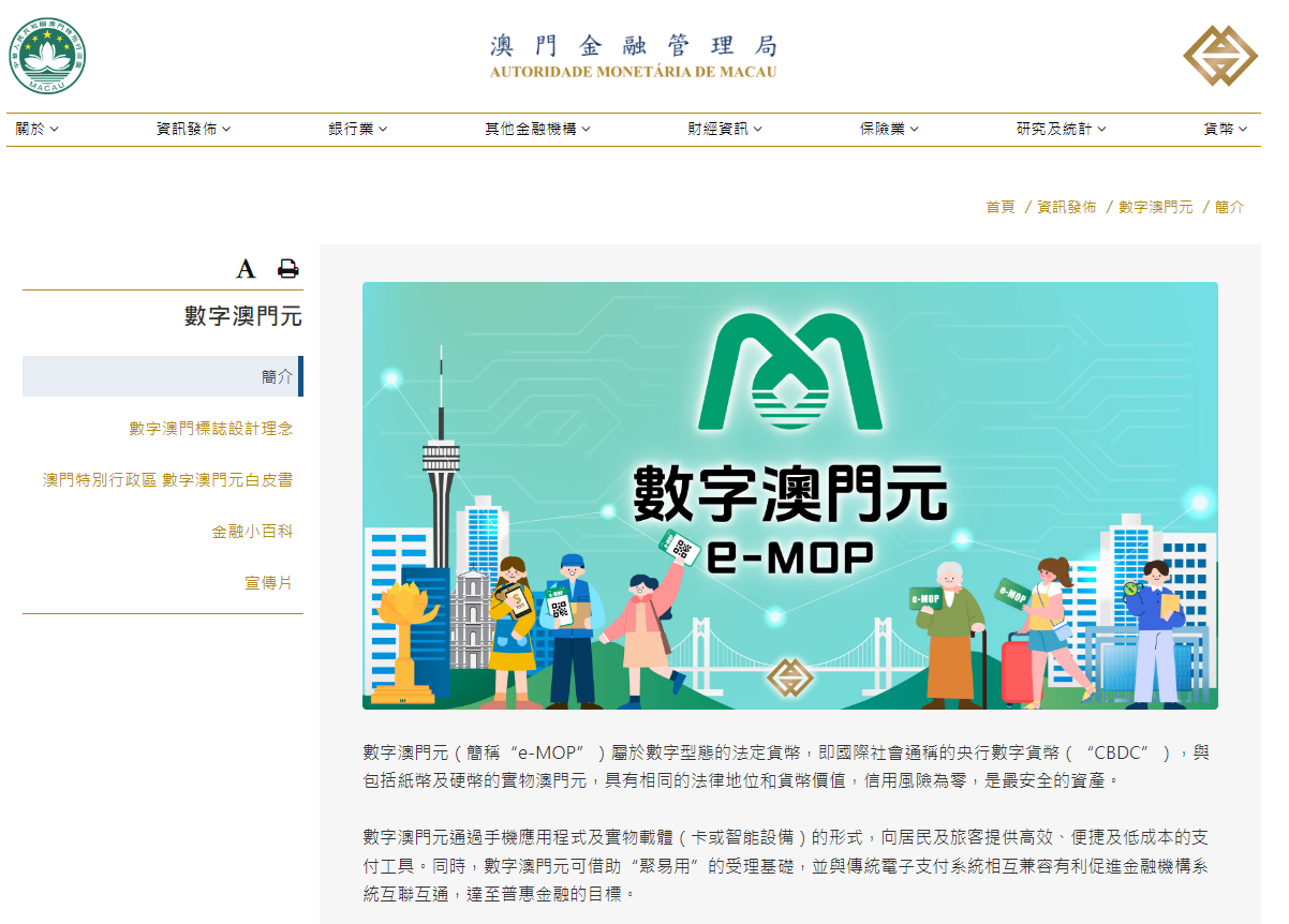 為令公眾進一步認識數字澳門元,金管局已開通專題網頁(https://www.amcm.gov.mo/zh-hant/news-notice/emop/emop-introduction),上載數字澳門元簡介、標誌設計理念、白皮書、小百科,以及宣傳片等資訊,並將持續豐富專頁內容。