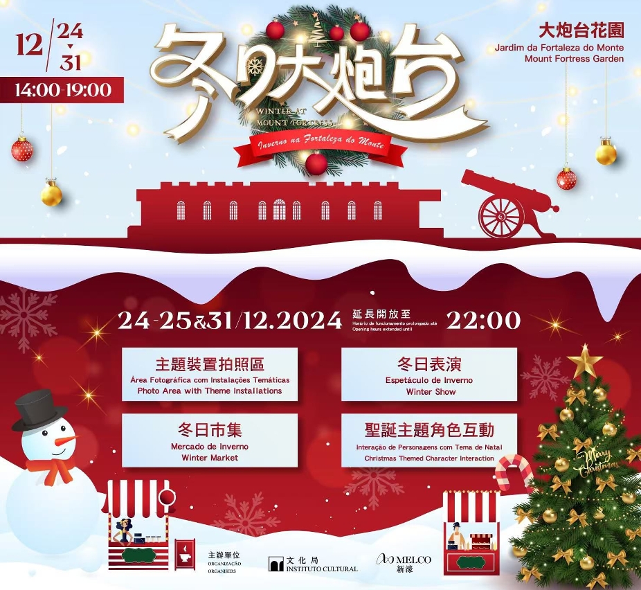 新濠博亞娛樂將於12月24日至31日期間在大炮台花園舉行“冬日下的大炮台”,場內設有與澳門博物館共同設計的大型節日裝置拍照區及節日燈飾,並設特色小食攤檔,以及多場現場音樂表演,增添冬日佳節氛圍。