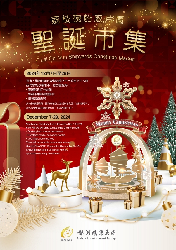 銀河娛樂集團於12月期間在荔枝碗船廠片區X11-X15設置聖誕裝置,逢周六、日及12月24日至25日下午1時至6時設有聖誕市集,內容包括特色遊戲攤位、餐飲設施、文創市集、藝文表演、兒童騎聖誕鹿遊戲及聖誕裝飾等,屆時特設免費穿梭巴士來回“澳門銀河™”綜合度假城之鑽石大堂和荔枝碗船廠片區。