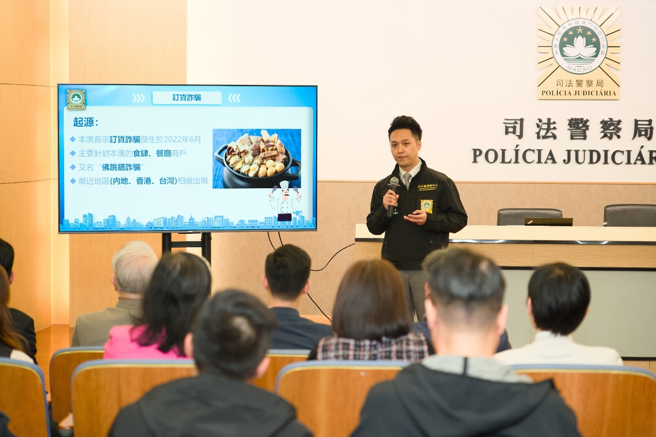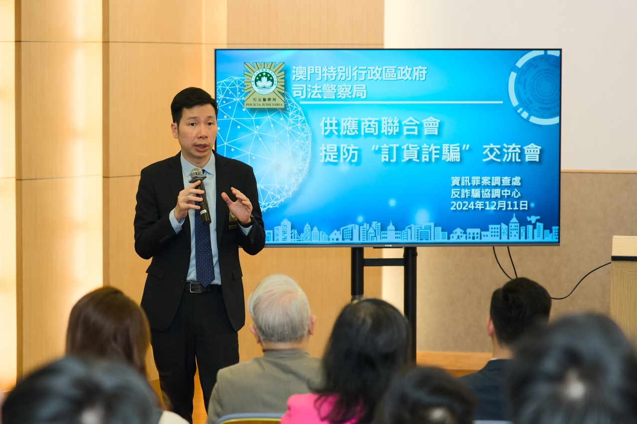 “提防訂貨詐騙交流會”於2024年12月11日在司法警察局舉行,司警局資訊罪案調查處龍漢威處長、澳門供應商聯合會李傑興理事長聯同21名不同行業的代表出席參與。交流會上,司警局資深刑偵人員結合真實案例,講解“訂貨詐騙”的最新作案手法、特徵及注意事項,以加強業界對“訂貨詐騙”手法的了解,司警局人員強調當接到陌生來電或訊息要求訂購大量貨品時,應提高警覺並先從相應的官方渠道查核事實,切勿急於促成交易;同時提醒商戶若收到任何轉帳或匯款的截圖時,應小心求證有關款項是否已到帳,以免陷入詐騙陷阱。