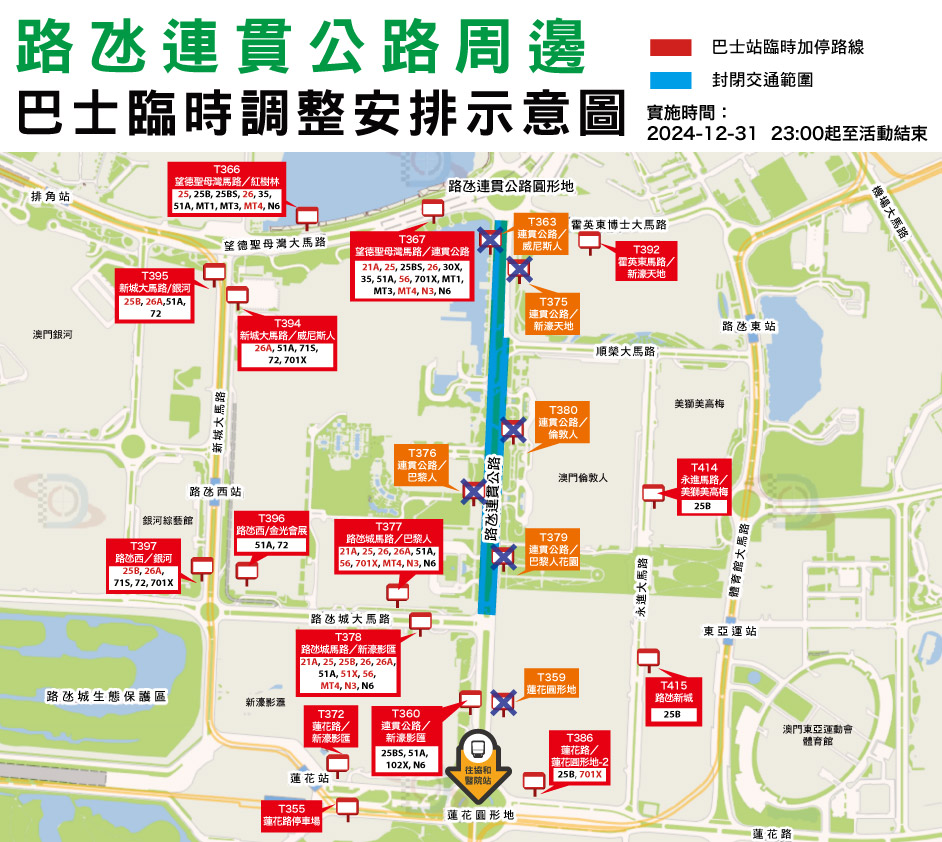 路氹連貫公路方面,於12月31日晚上11時至翌日凌晨1時需臨時停用“連貫公路/新濠天地"站、“連貫公路/倫敦人"站、“連貫公路/巴黎人花園"站、“蓮花圓形地"站、“連貫公路/巴黎人”及“連貫公路/威尼斯人"站,21A、25、25B、26、26A、51A、56及MT4路線自晚上11時起至尾班車將會改道行駛並將臨時調整停靠站點;701X、N3及N6亦將改道行駛並臨時調整停靠站點至活動結束;25B特班車(25BS)路線於2024年12月31日晚上10時至翌日凌晨3時及51X(往關閘-單向)路線於2024年12月31日晚上10時至翌日凌晨1時增開服務,同樣將配合臨時交通措施而改道行駛及臨時調整停靠站點,詳情可參閱兩巴網頁(澳巴:http://www.tcm.com.mo、新福利:http://www.transmac.com.mo)。