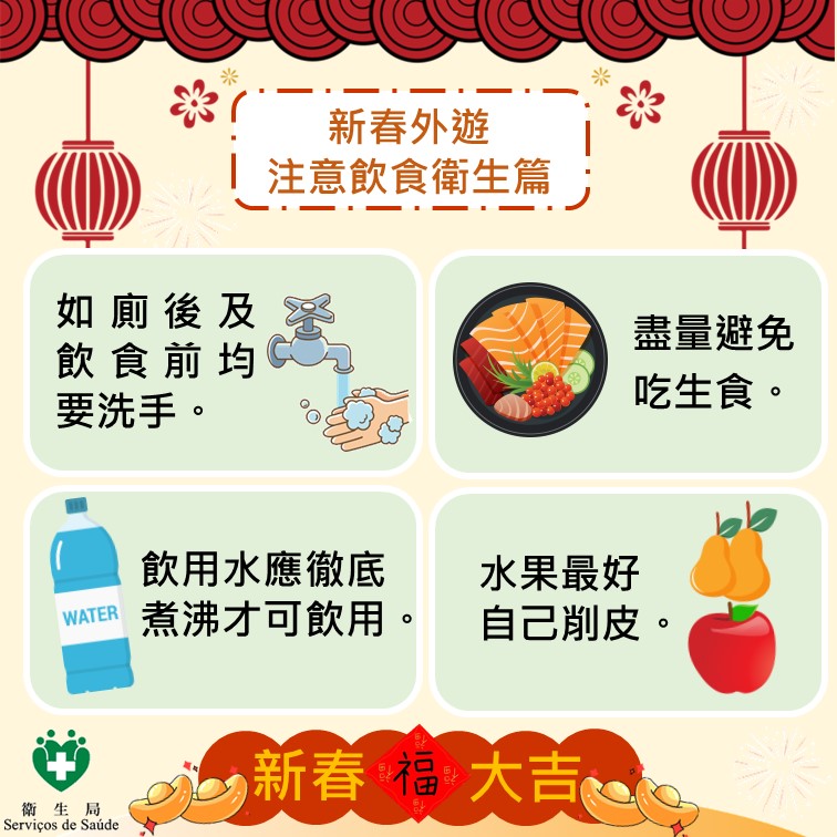 隨着春節假期臨近,不少居民會外遊或探親,為確保健康與安全,衛生局特別提醒居民在外遊期間,應加強個人、食物及環境衛生,注意防範床蝨叮咬,並預防感染登革熱、呼吸道傳染病、胃腸道疾病等,採取足夠有效的預防措施以降低感染疾病的風險。