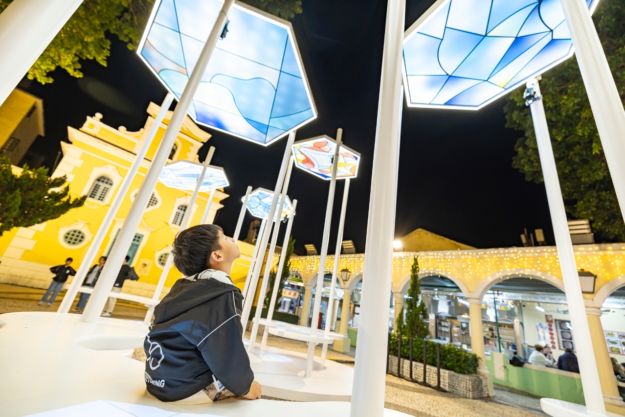 “琉璃花園”:設在馬忌士前地的燈飾裝置,透過美輪美奐的燈光投影效果,讓大家感受澳門的悠閒節奏。