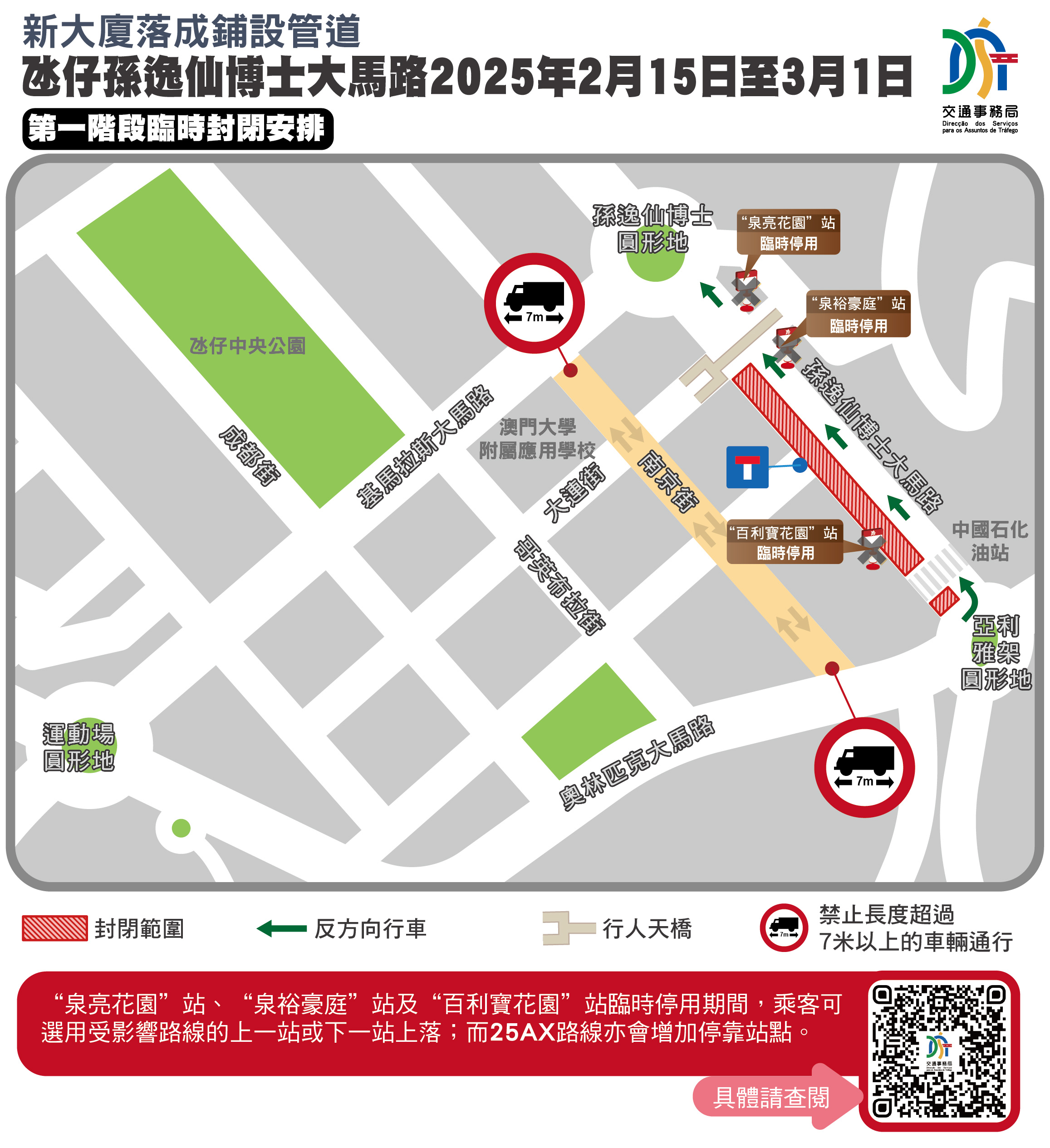 因應有新大廈落成須進行工程連接管道,介乎亞利雅架圓形地與孫逸仙博士圓形地的一段氹仔孫逸仙博士大馬路自2月13日起實施臨時交通措施,並於2月15日至3月15日期間分階段實施封閉交通,24條巴士線受影響。
