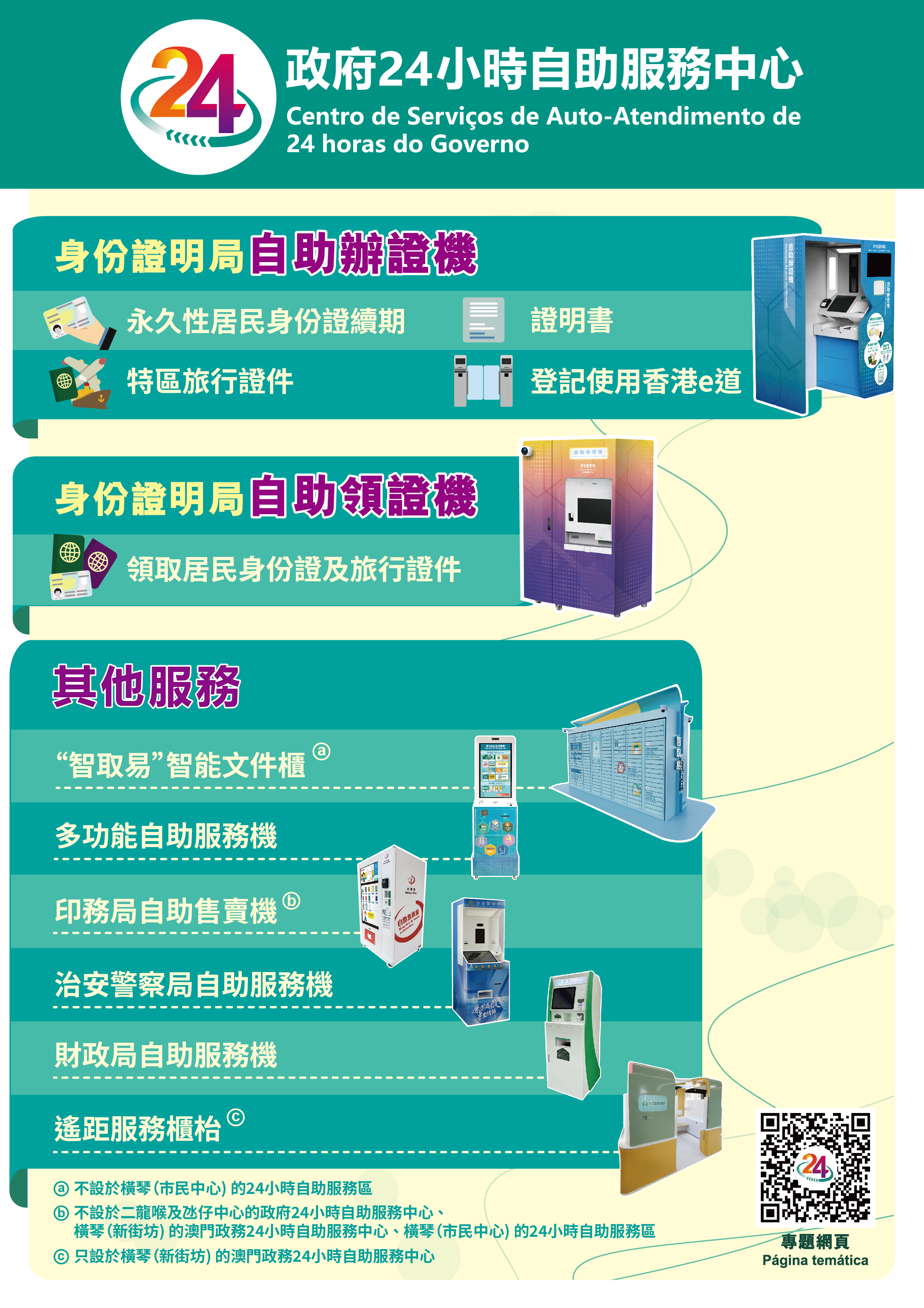 由身份證明局聯同市政署設於三盞燈綜合大樓的政府24小時自助服務中心今(12日)啟用,提供身份證明、社會福利、稅務查詢、市政服務、選民登記、交通出行及出入境等12個部門近70項服務,方便區內居民於任何時間自助申領證件及辦理所需服務。