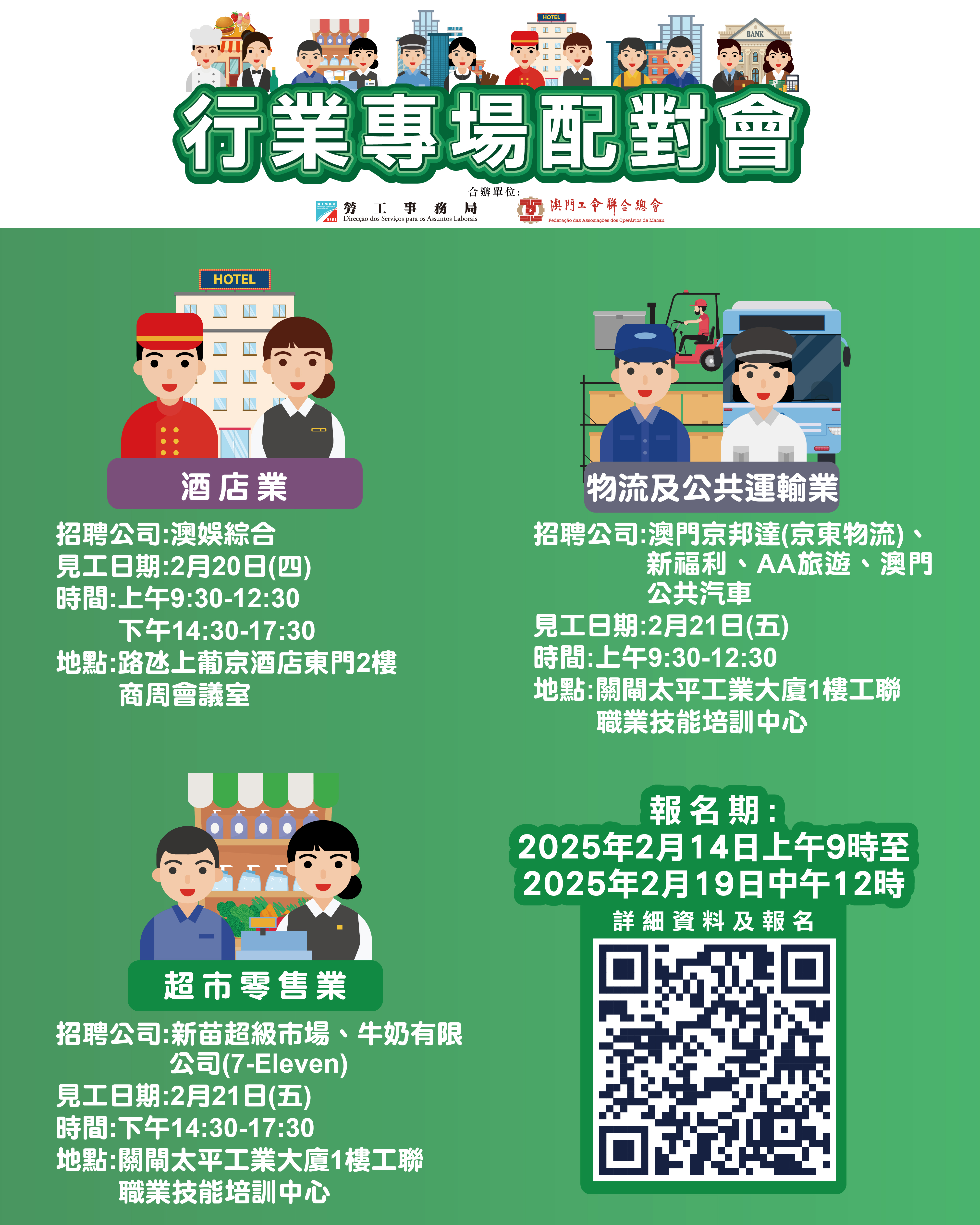 2月20日酒店業專場配對會在澳門上葡京二樓商周會議廳舉行;2月21日上午物流及公共運輸業專場配對會和下午超市零售業專場配對會在澳門工聯職業技能培訓中心(關閘馬路101-105A號太平工業大廈第一期1樓)舉行。報名日期為2月14日上午9時至2月19日中午12時。