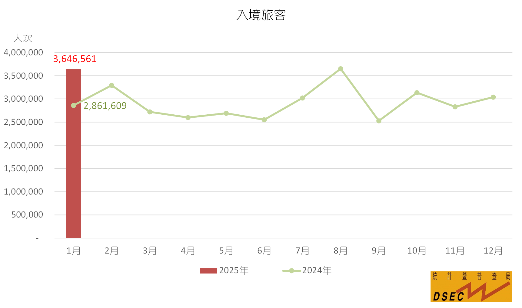 統計暨普查局資料顯示,2025年1月入境旅客共3,646,561人次,按年上升27.4%。不過夜旅客(2,155,279人次)及留宿旅客(1,491,282人次)同比分別增加45.6%及7.9%。旅客平均逗留時間為1.0日,較去年同期縮短0.2日,主要是不過夜旅客佔比按年上升所致;不過夜旅客平均逗留時間(0.3日)增加0.1日,留宿旅客(2.2日)則維持不變。