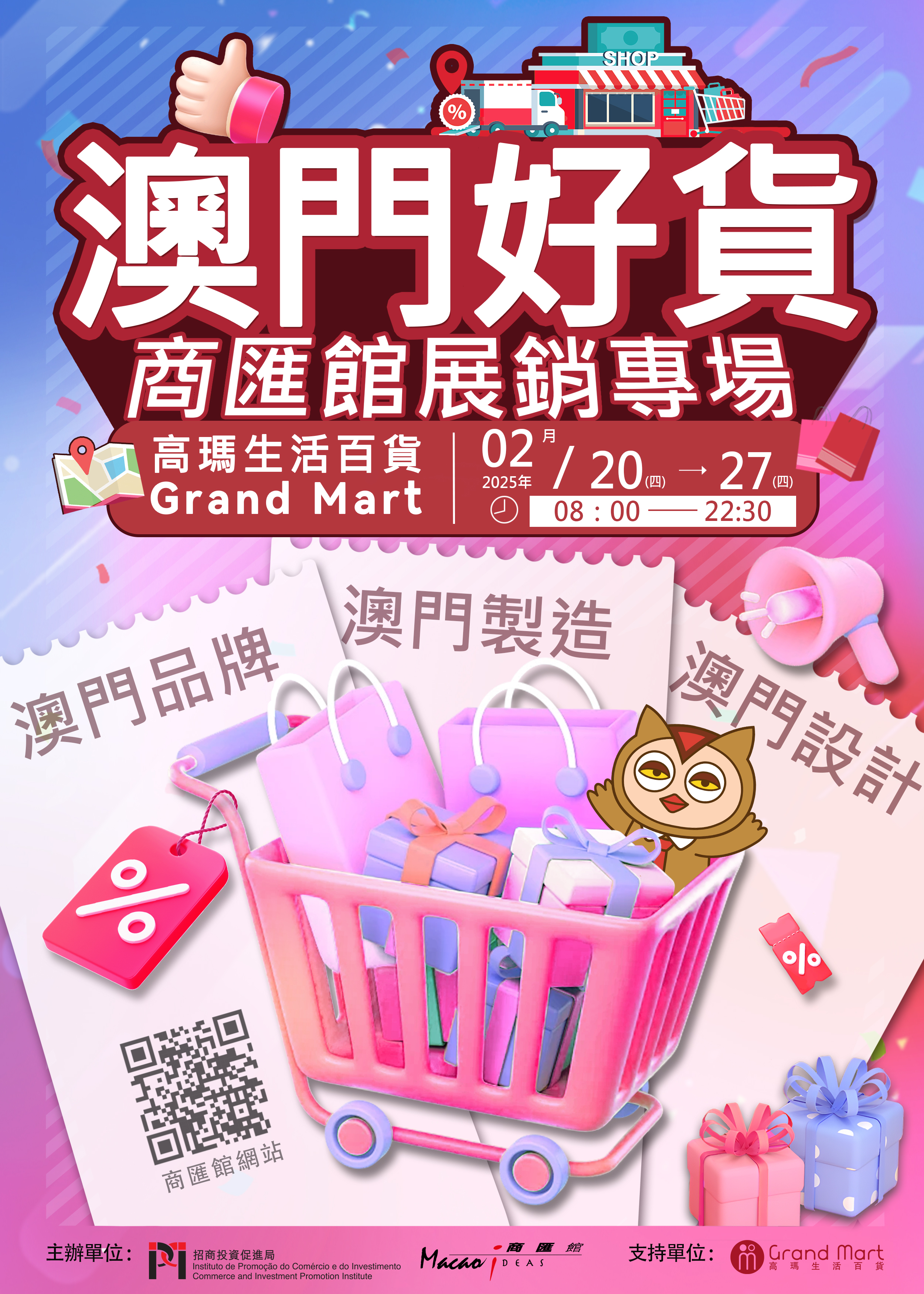 活動由2月20至27日於氹仔高瑪生活百貨(Grand Mart)舉行,展銷品類多元,過百款“澳門好貨”涵蓋手信餅食、點心麵食、海味燕窩、養生茶包、酒類、保健品、洗浴用品及寵物用品等,滿足不同客群的購物需求。現場更於指定時段設“打卡送好禮”活動,分享指定影片和打卡即可獲商匯館限量紀念品一份。數量有限,贈完即止。