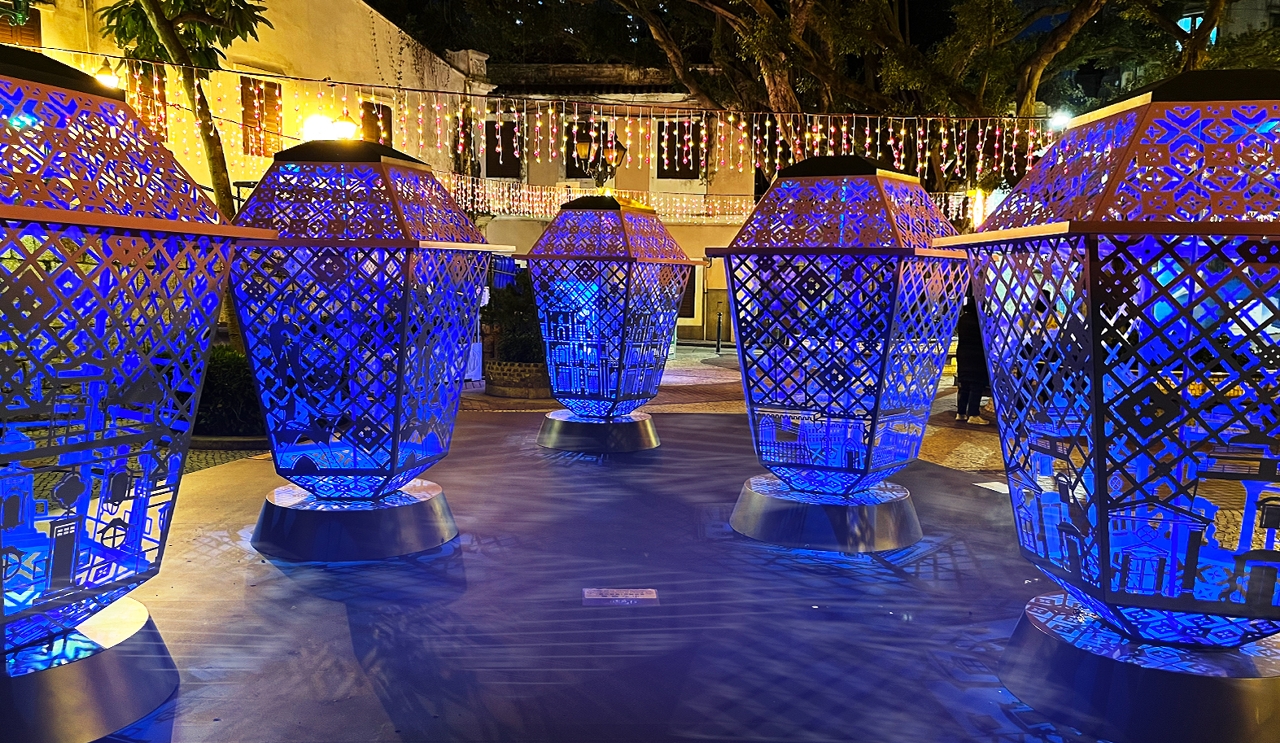 “街燈裡的澳門”:位於亞婆井前地的互動裝置展示澳門著名景點,彷如訴說一個個澳門故事。