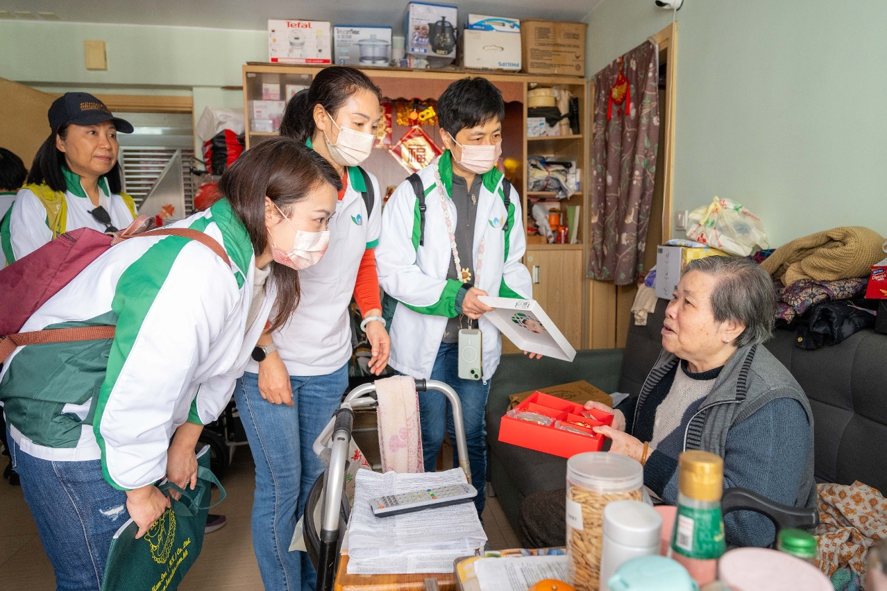 隨後,義工隊員帶同湯圓及賀年餅食禮包,前往青洲及台山區探訪獨居長者,傳遞節日問候,藉閒話家常瞭解長者的生活狀況,解答使用電器時遇到的問題,並協助檢查供水及電器設備等,期望為長者的家居提供安全環境。