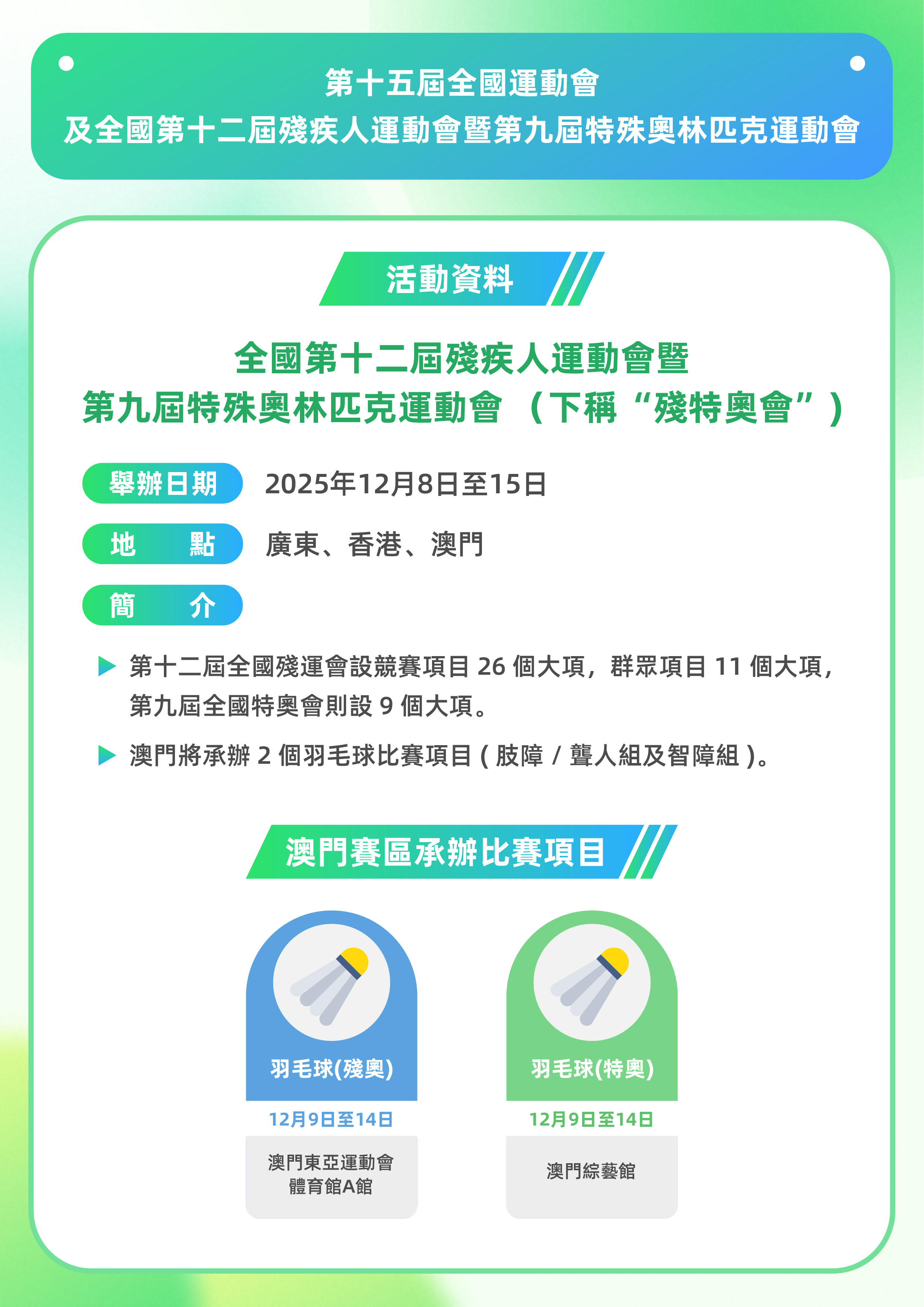 如欲參閱更多賽事資料,可瀏覽賽事官方網頁www.2025nationalgames.gov.mo。同時,歡迎關注“第十五屆全運會澳門賽區”Facebook 專頁及“全運會殘特奧會澳門賽區”微信公眾號。