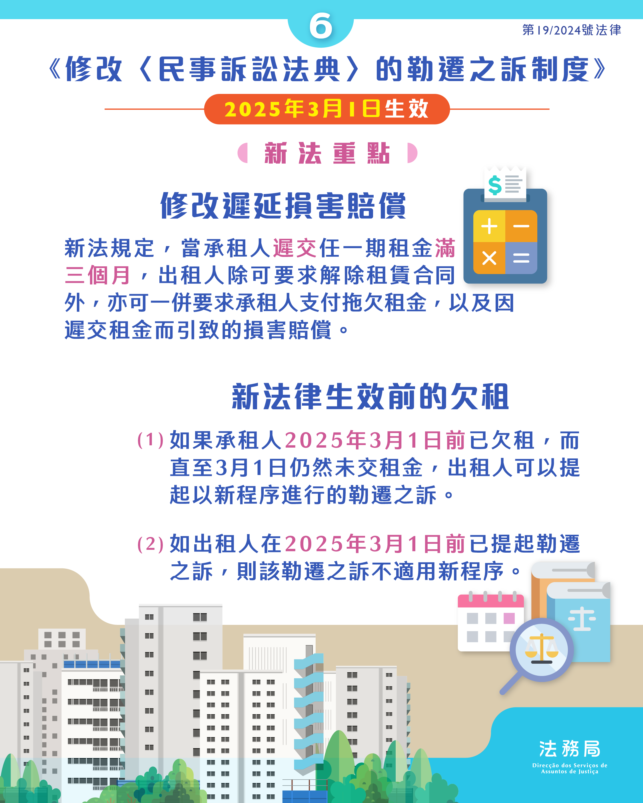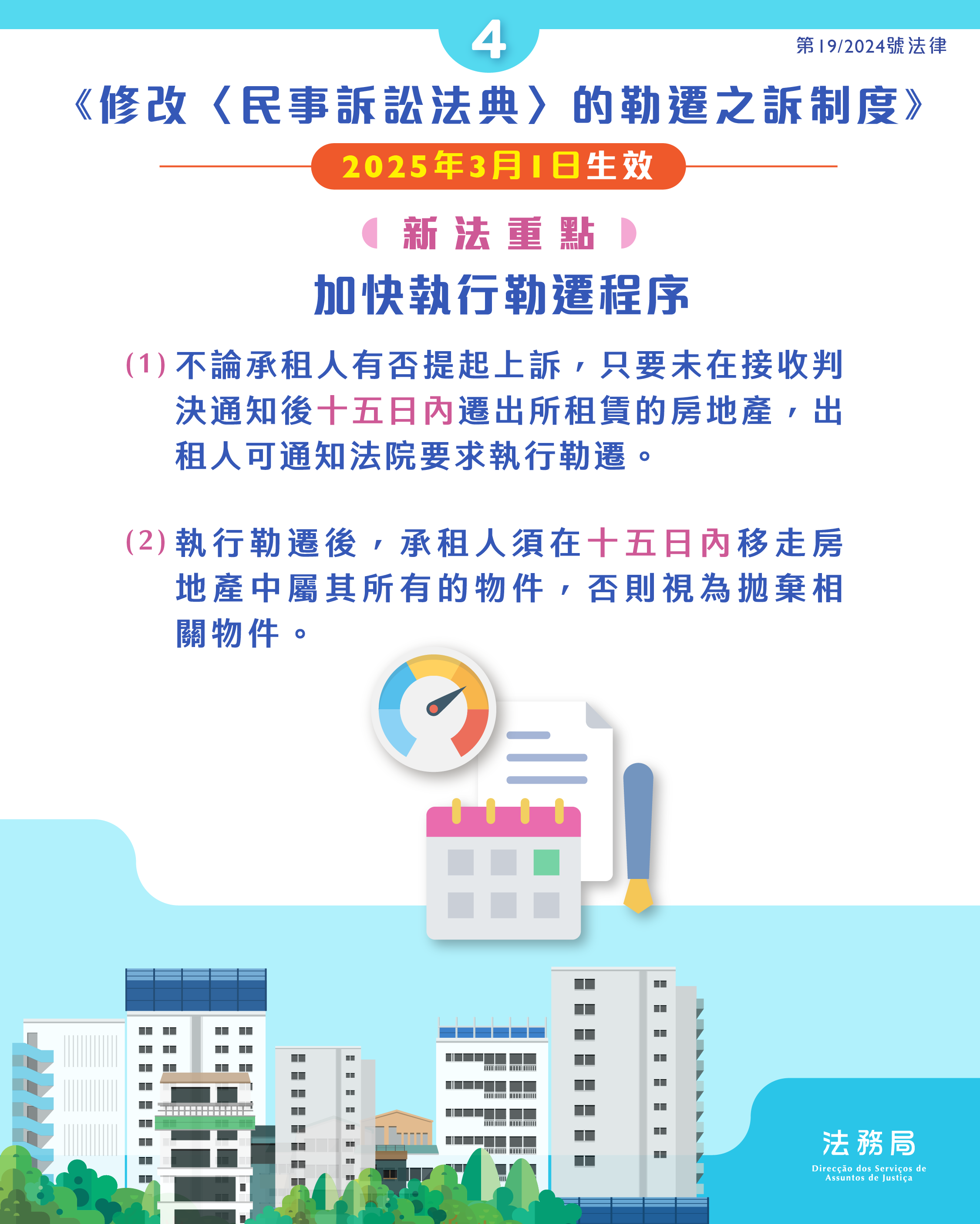 第19/2024號法律《修改〈民事訴訟法典〉的勒遷之訴制度》將於明(1日)生效,在原勒遷之訴基礎上,“新勒遷制度”針對長時間欠租情況,增設更簡單快捷的勒遷之訴新程序,簡化訴訟流程,並新增在特定情況下將承租人列入查閱資料的機制,有利於針對長期拖欠租金的租霸問題,業主能有效地收回被霸佔的單位。