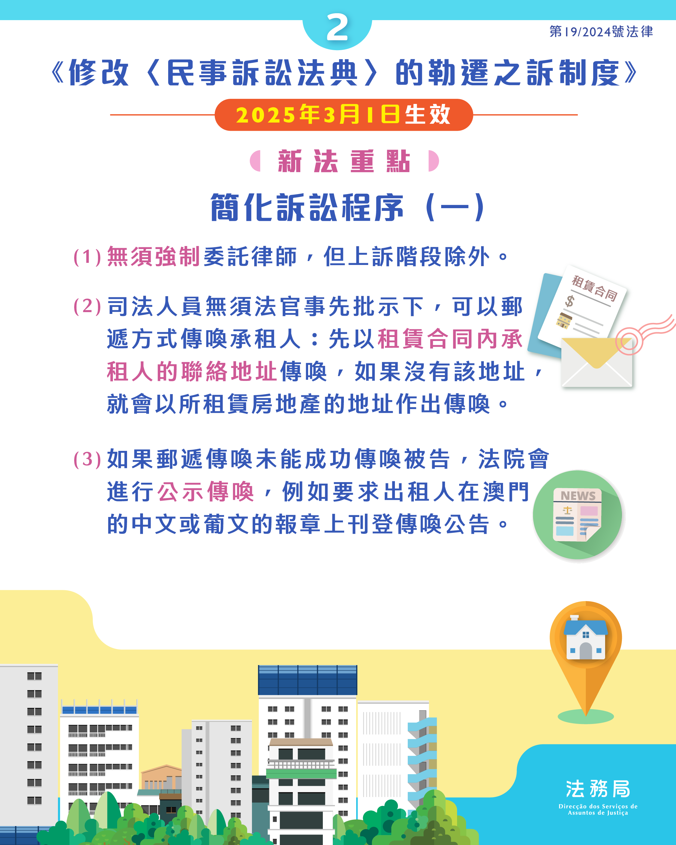 傳喚方面,明確規定司法人員先以租賃合同內承租人的聯絡地址傳喚,如沒有該地址,則以所租賃房地產的地址作出傳喚。如郵遞傳喚未能成功,則立即進行公示傳喚。