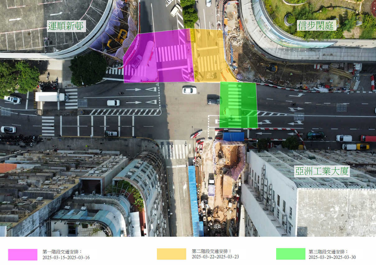 配合沙梨頭海邊大馬路行人天橋建造工程(第一期)的天橋鋼結構吊裝工作,3月15日、16日、22日、23日、29日及30日,每日凌晨零時至上午6時,沙梨頭南街及沙梨頭海邊大馬路將實施封閉交通,詳情可查閱附表一。