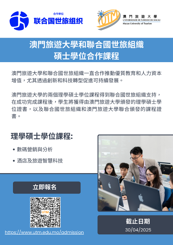 課程入學申請期自即日起至2025年4月30日止。澳門旅遊大學提供多種獎學金以及其他類型資助。如欲了解更多詳情,請瀏覽澳門旅遊大學網頁https://www.utm.edu.mo/s/TC_UNCollaborativeProgrammes。