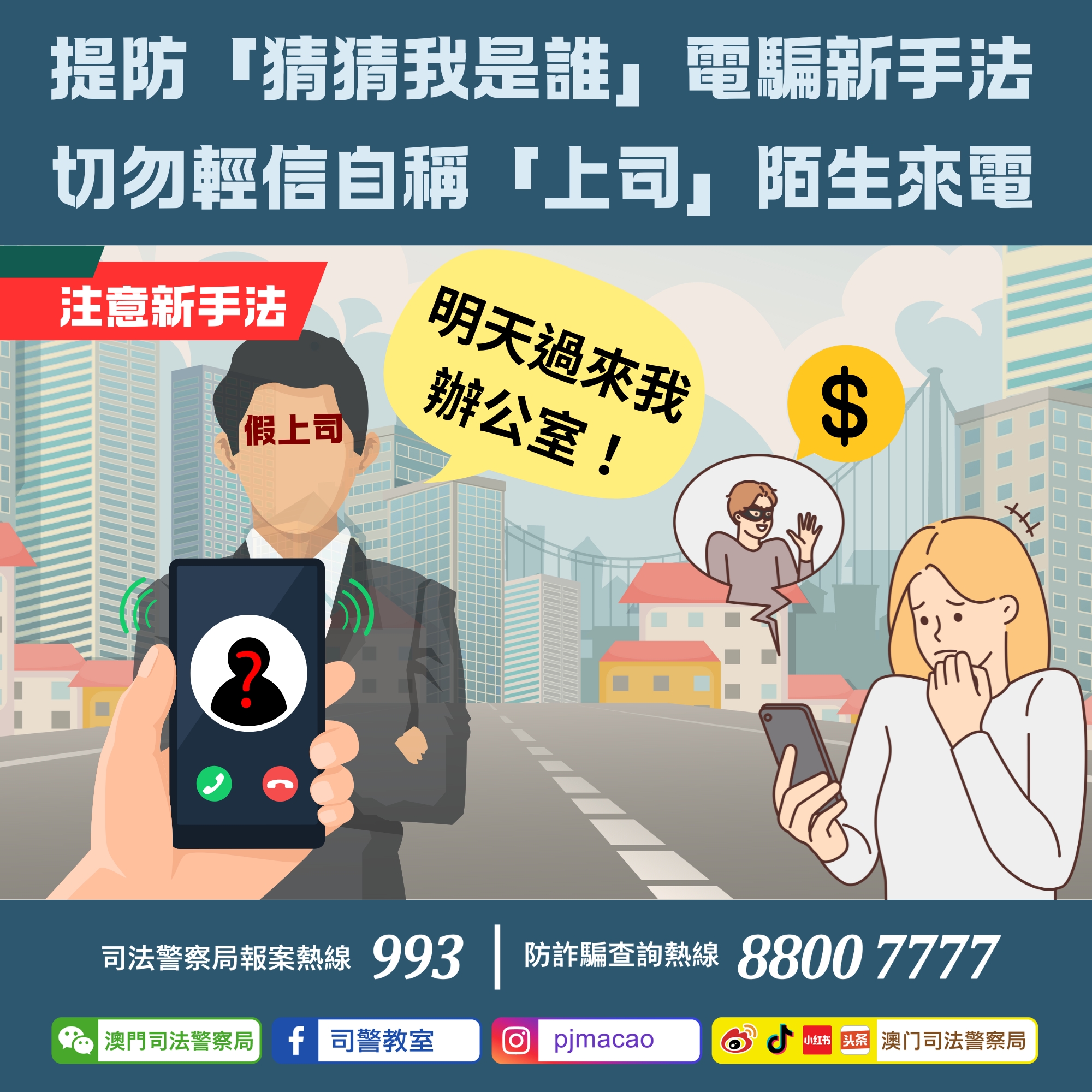 4.如有懷疑,可致電司警局防詐騙查詢熱線88007777或報案熱線993求助,又或使用司法警察局“反詐程式"查核風險指數及認識各類騙案手法。