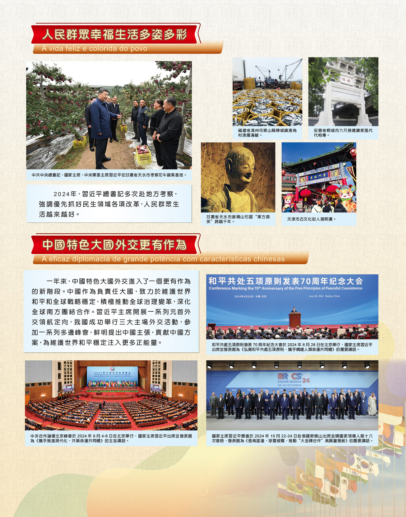 展覽在序章部分介紹了國家發展取得新的偉大成就。回顧2024年,隆重慶祝了中華人民共和國成立75周年,勝利召開中共二十屆三中全會,國家高質量發展扎實推進,高水平科技自立自強,人民群眾幸福生活多姿多彩,中國特色大國外交更有作為。