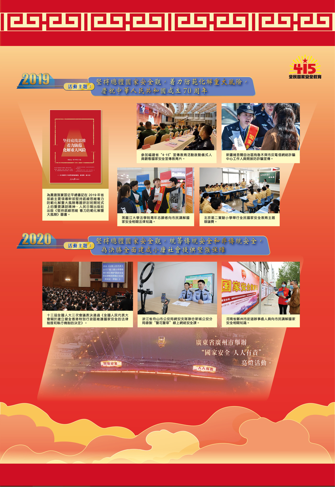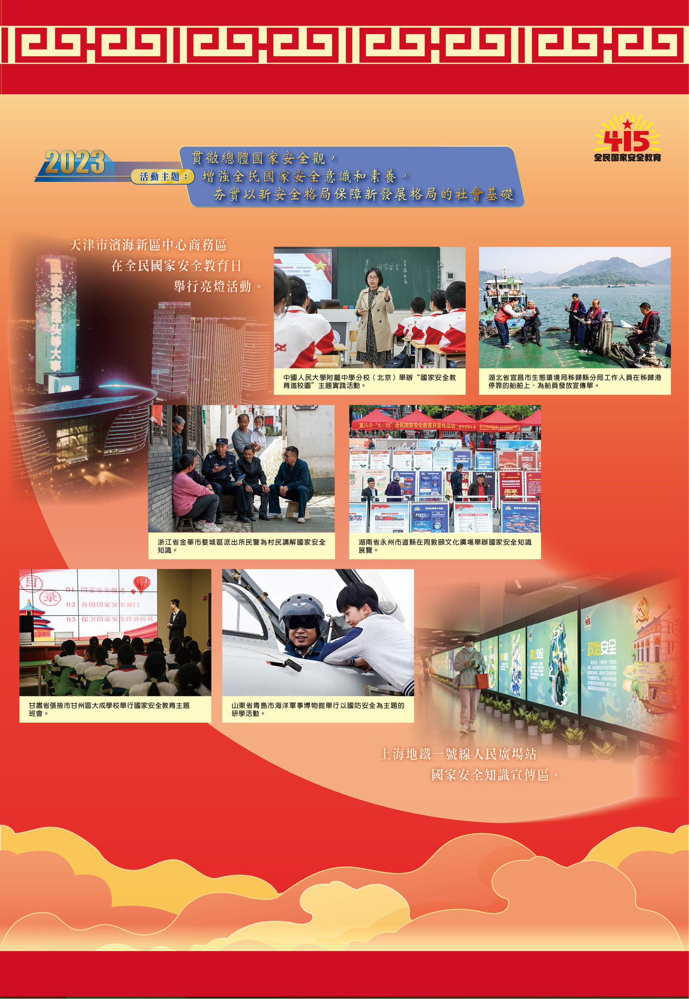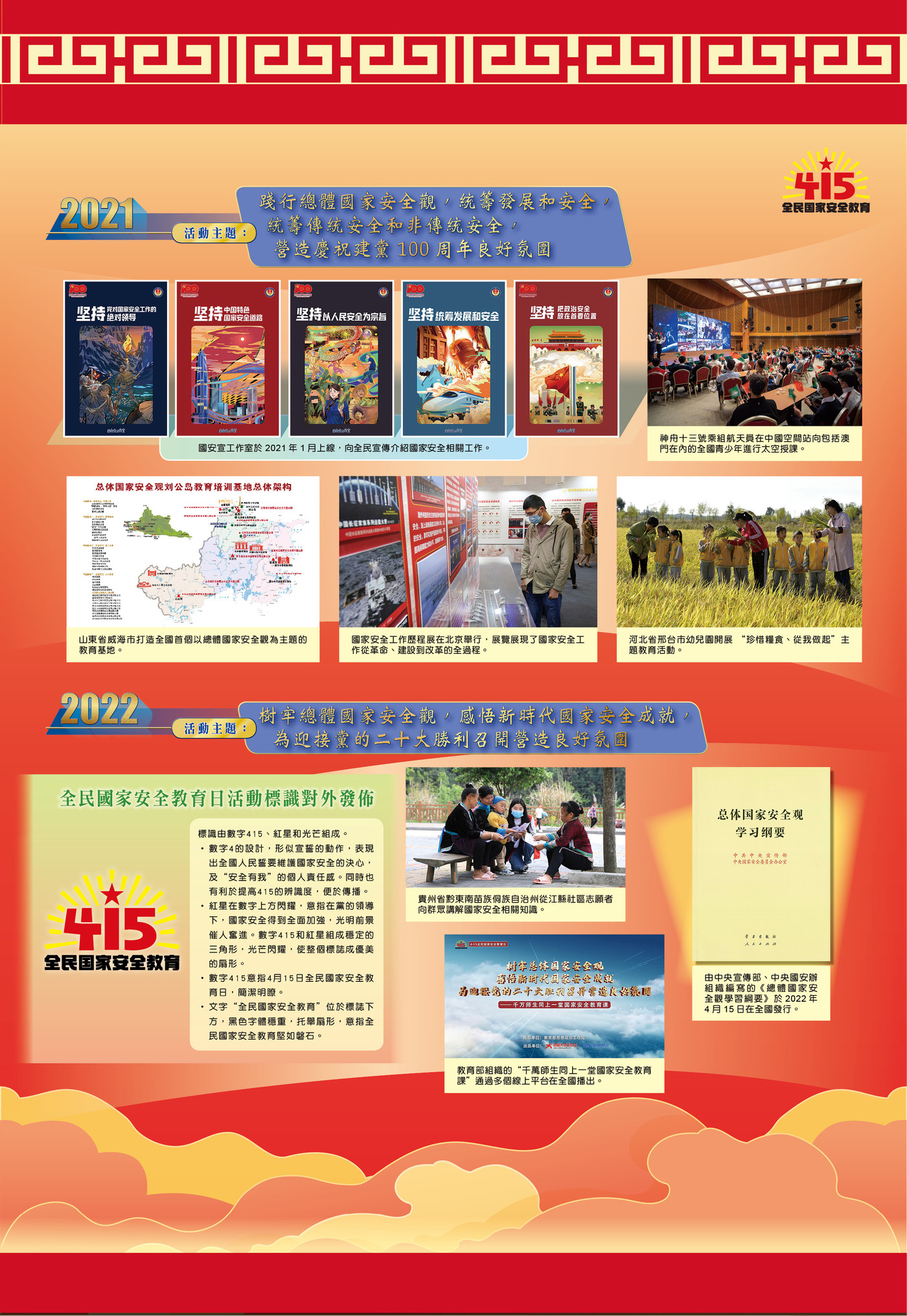 展覽第一部分“推陳出新,走深走實,掀起國安宣傳教育新熱潮”,展示了過去10年全面貫徹落實總體國家安全觀、我國國家安全工作取得歷史性成就。10年來,全國各地圍繞全民國家安全教育日活動主題,廣泛開展一系列國安宣教活動,推動“大安全”理念深入人心、落地生根。近年來,在上海、四川、海南及香港特區等地建設了一批國家安全宣傳教育基地(展館),為普及國家安全知識、增強全民國家安全意識發揮了積極作用。