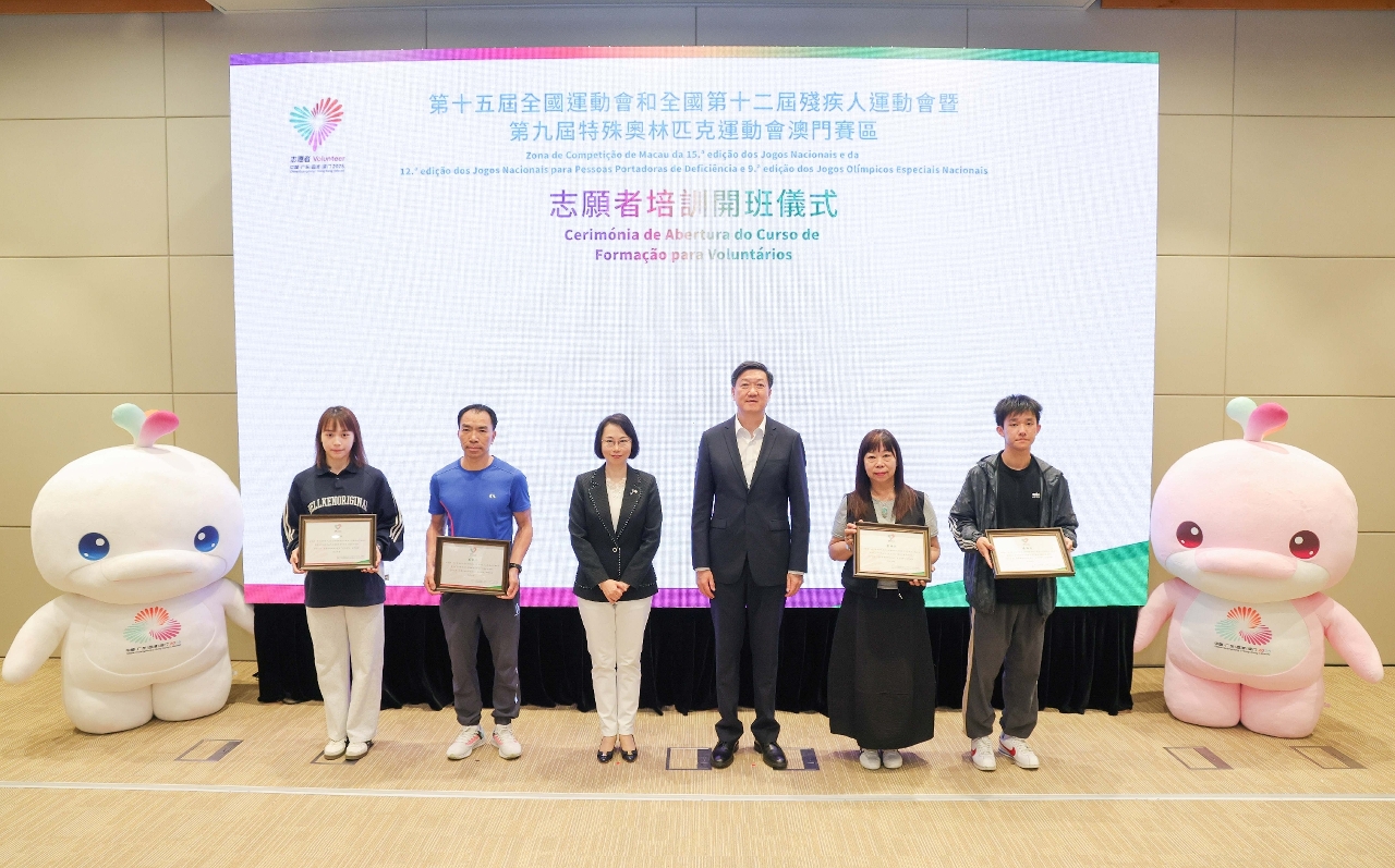 第十五屆全國運動會和全國第十二屆殘疾人運動會暨第九屆特殊奧林匹克運動會(下稱“十五運會和殘特奧會”)澳門賽區志願者培訓開班儀式今(21)日在運動員培訓及集訓中心演講廳舉行,國家體育總局局長、十五運組委會主任高志丹,及十五運會及殘特奧會澳門賽區組委會主席、社會文化司司長柯嵐等嘉賓出席,標誌著澳門賽區志願者工作進入更系統化培訓階段。