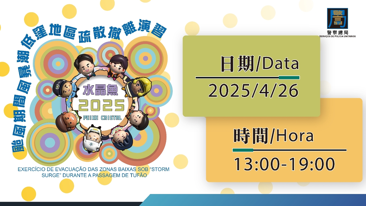 隨著本澳颱風季節即將來臨,為加強社區的防災意識,民防架構將於明日(4月26日)星期六下午一時至七時,進行代號“水晶魚2025”民防颱風演習。