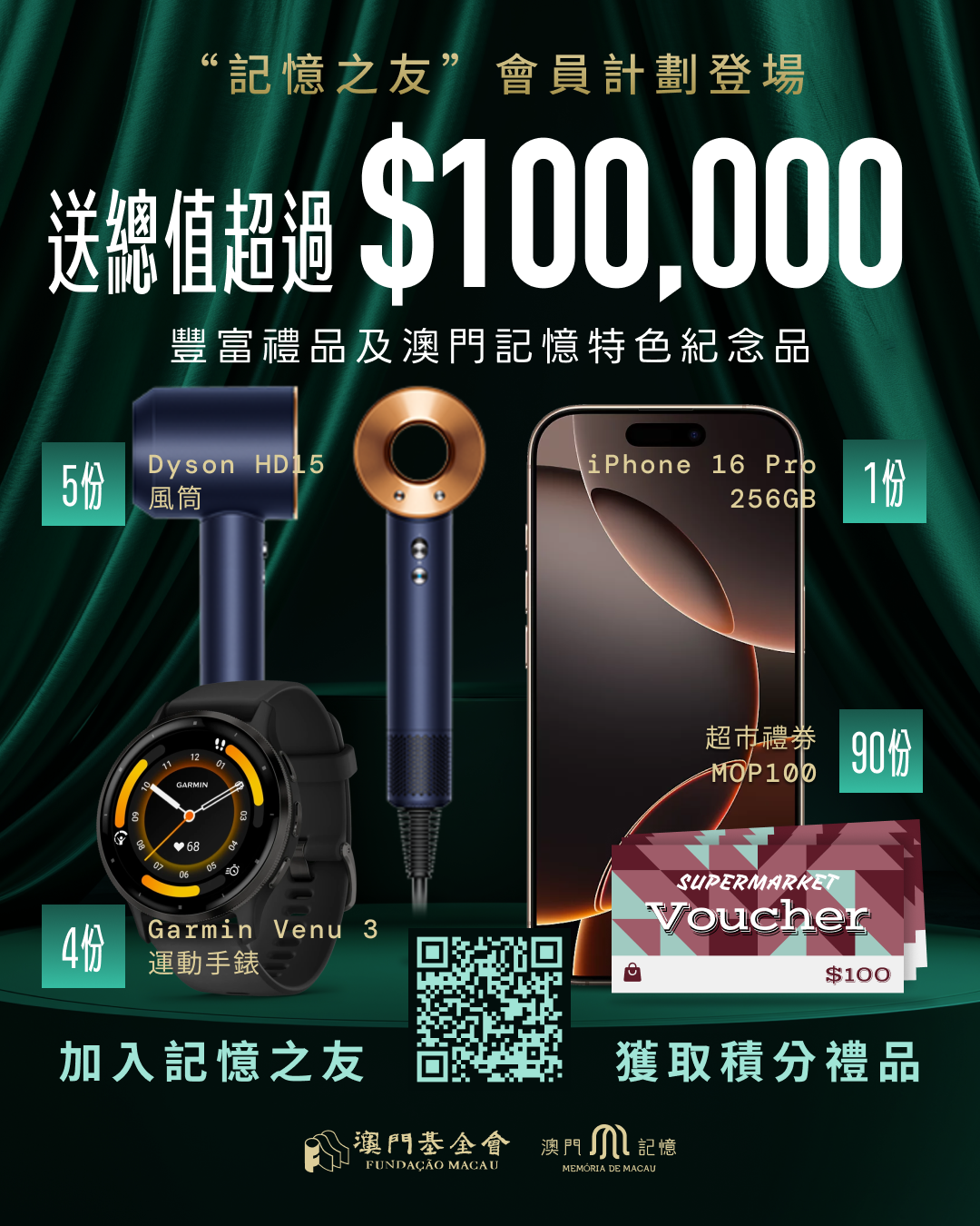 為了更好地聯動各項線上線下活動,並進一步推動市民參與“澳門記憶”,在原有會員制度基礎上,推出“記憶之友年度積分回饋計劃",讓一眾會員在“澳門記憶”文史網的每個網路足跡與活動身影,化作記憶“里程”,獲取年度豐富禮品。“記憶之友”參與“澳門記憶”線上線下活動或在網站每日簽到,將獲得相應之積分,年末達指定積分即可換領不同禮品,總值超過100,000澳門元。位列積分排行榜最高的第1至100名“記憶之友”的豐富禮品包括︰第1名獲iPhone 16 Pro手機、第2至5名獲Garmin運動手錶、第6至10名獲Dyson風筒,第11至100名獲超市禮券(100澳門元)。此外,為了答謝“記憶之友”的參與和支持,年度累積積分達20分以上,將可登記換領“澳門記憶”特色禮品,預計於本年11月開放登記,登記名額有限,換完即止。