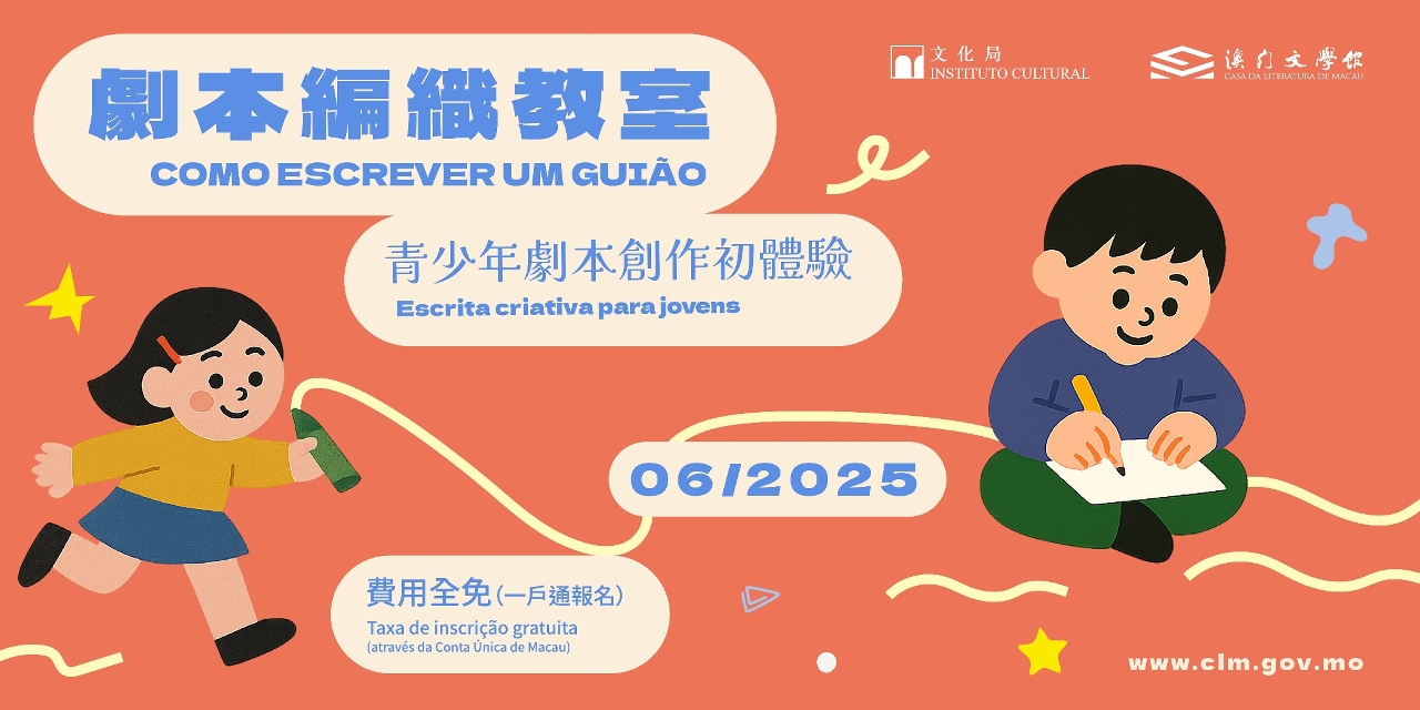 “劇本編織教室──青少年劇本創作初體驗”分別於6月7日、15日、21日及28日下午2時30分至5時在澳門文學館舉行,對象為13至18歲的青少年。課堂內容涵蓋現代與當代劇本分析,讓參加者理解各種風格與結構,以及透過有趣的寫作練習,學習建立故事的前提、塑造角色和撰寫生動的對白,並在導師的指導下,創造出引人入勝的劇情,完成一個短劇的呈現。