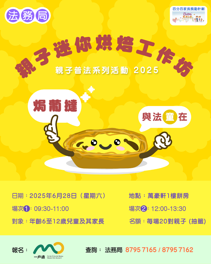 由於工作坊報名反應熱烈,法務局將於2025年6月28日加開兩場以葡撻為主題的親子迷你烘焙工作坊,每場工作坊的名額將增加至20對親子,歡迎本澳年滿6至12歲兒童及其家長參加。有關活動已納入“百分百家長獎勵計劃”,有興趣者可透過一戶通的“活動報名”頁面報名,如報名人數超過限額,將以電腦抽籤方式決定,詳情請參閱活動海報。如有任何查詢,歡迎致電法務局公共關係處黃小姐或楊小姐(8795 7165 / 8795 7162)。